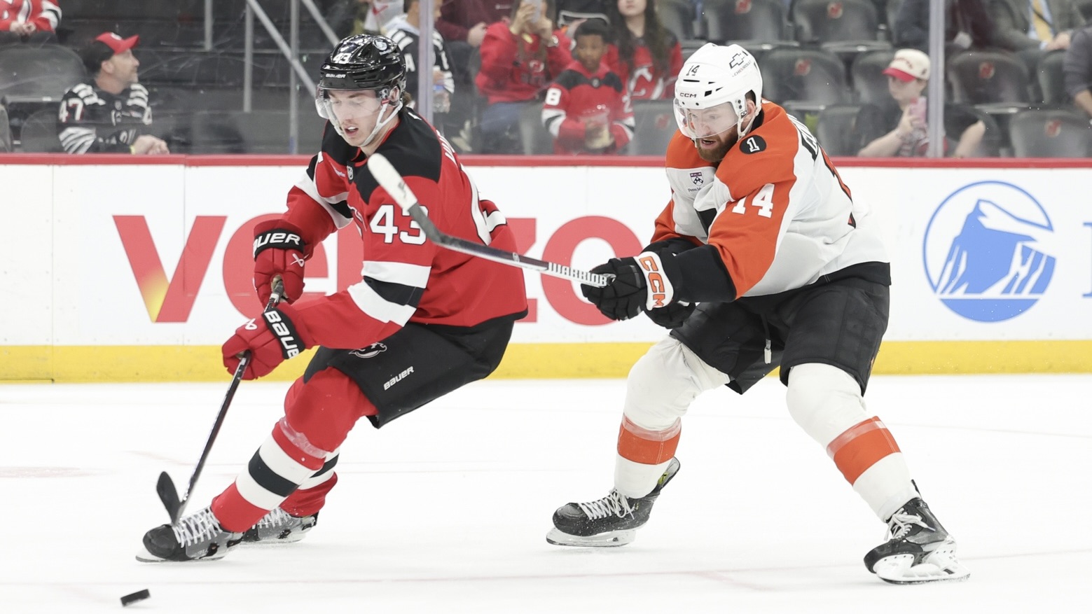 Devils shellacked by surging Flyers, 5-1Cody Glass scored New Jersey's lone goal4/8/2026, 2:30 AMAssociated PressNew Jersey Devils defenseman Luke Hughes (43) skates with the puck against the Philadelphia Flyers during the third period at Prudential Center. / Luther Schlaifer-Imagn Images