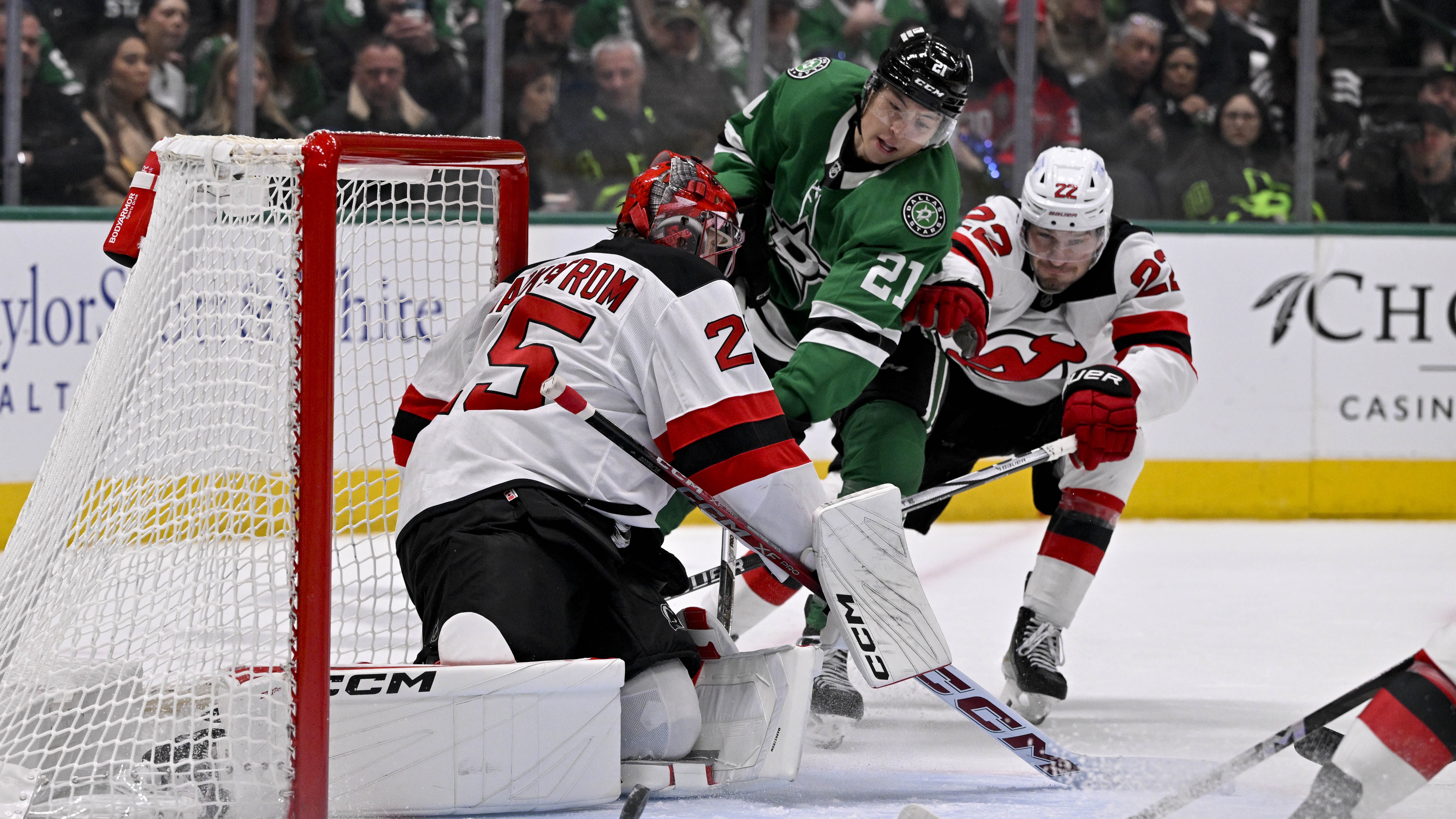 Mar 4, 2025; Dallas, Texas, USA; New Jersey Devils goaltender Jacob Markstrom (25) and defenseman Brett Pesce (22) stops a shot by Dallas Stars left wing Jason Robertson (21) during the second period at the American Airlines Center / Jerome Miron-Imagn Images