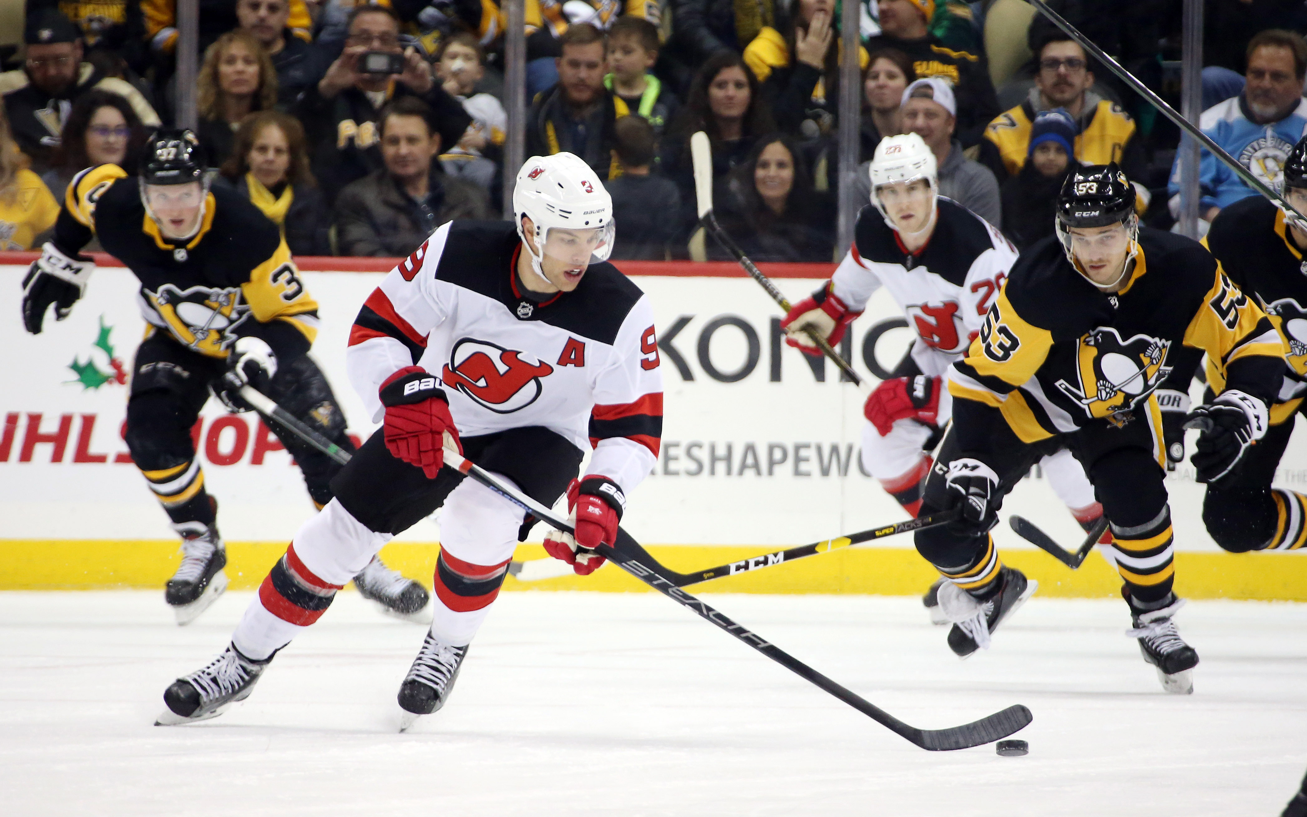 Nov 22, 2019; Pittsburgh, PA, USA; New Jersey Devils left wing Taylor Hall (9) skates with the puck against the Pittsburgh Penguins during the third period at PPG PAINTS Arena. Pittsburgh won 4-1. Mandatory Credit: Charles LeClaire-USA TODAY Sports / Charles LeClaire