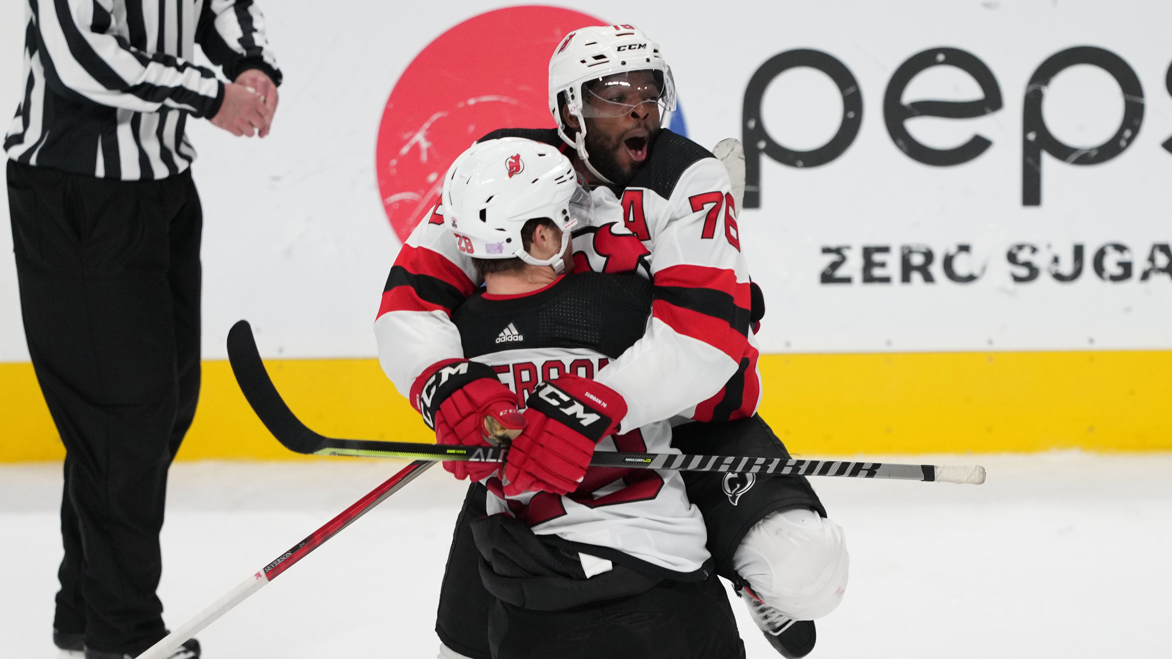 Nov 6, 2021; San Jose, California, USA; New Jersey Devils defenseman Damon Severson (28) celebrates with defenseman P.K. Subban (76) after scoring a goal against the San Jose Sharks during a shootout at SAP Center at San Jose. / Darren Yamashita-USA TODAY Sports