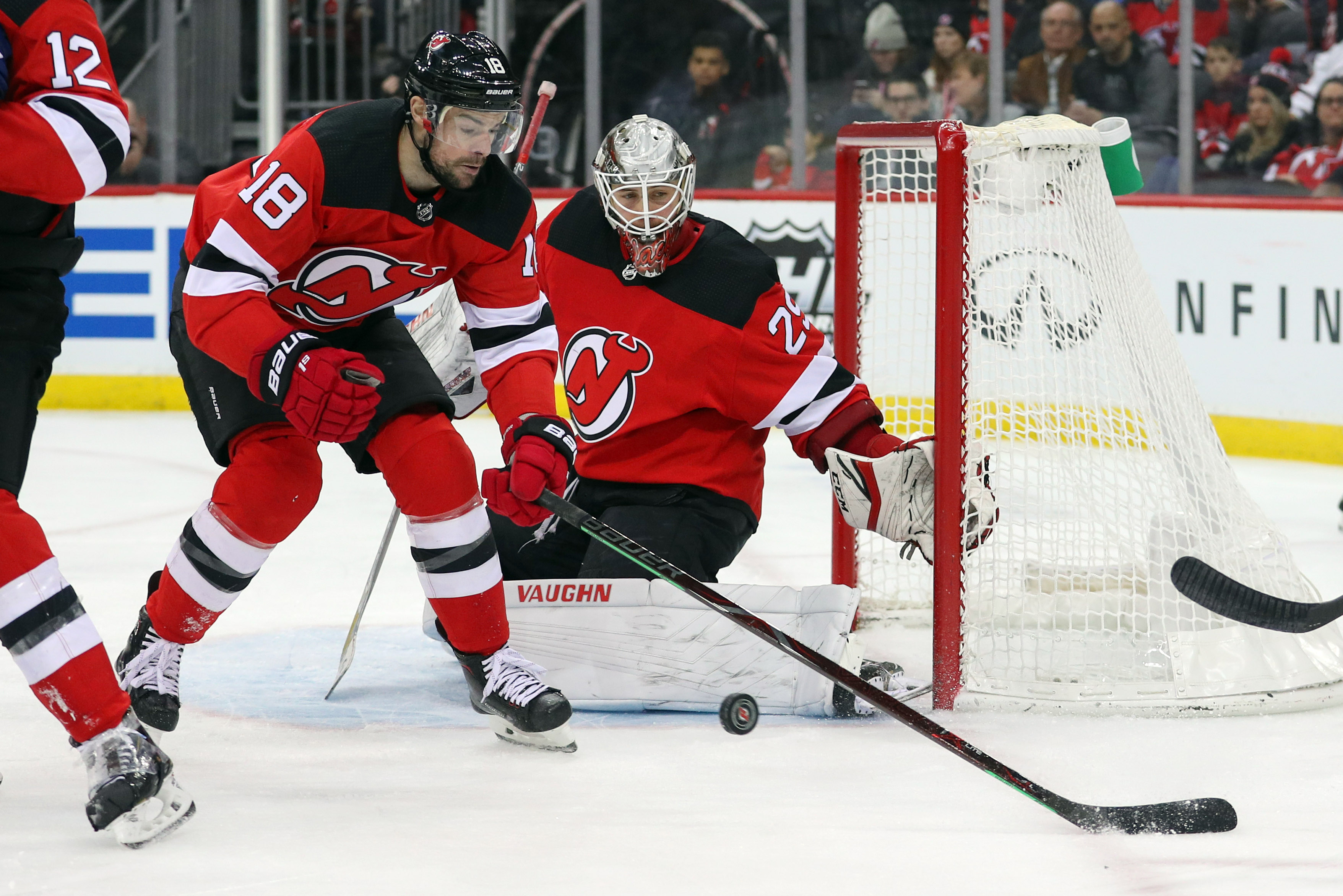 Dec 31, 2018; Newark, NJ, USA; New Jersey Devils right wing Drew Stafford (18) plays the puck after a save by goaltender Mackenzie Blackwood (29) during the third period of their game against the Vancouver Canucks at Prudential Center. Mandatory Credit: Ed Mulholland-USA TODAY Sports / Ed Mulholland