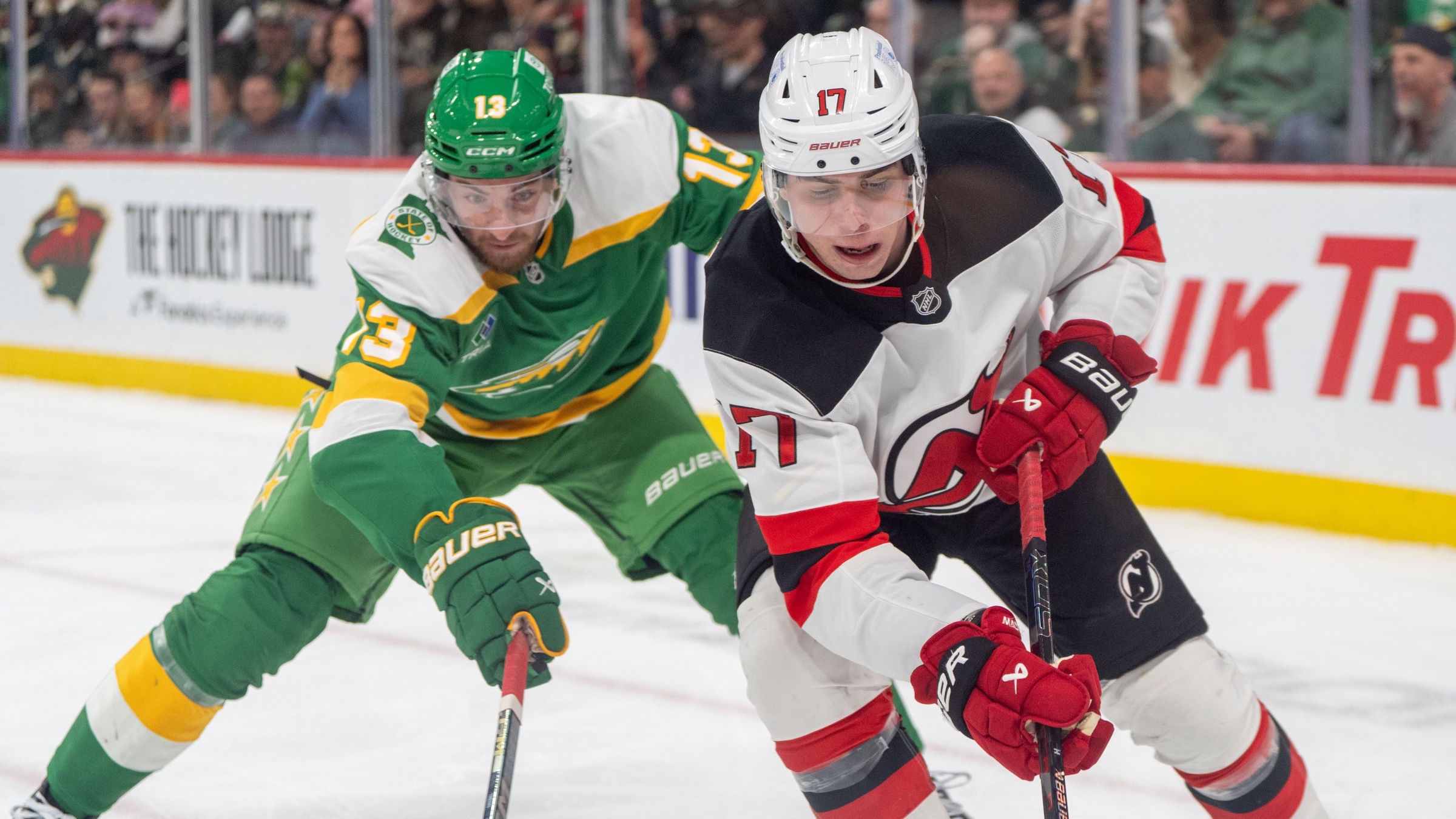Devils beat Wild, 5-2, behind Nico Hischier's hat trickHischier has career-high 33 goals this season3/30/2025, 1:06 AMAssociated PressMinnesota Wild center Yakov Trenin (13) stick checks New Jersey Devils defenseman Simon Nemec (17) in the second period at Xcel Energy Center. / Matt Blewett-Imagn Images