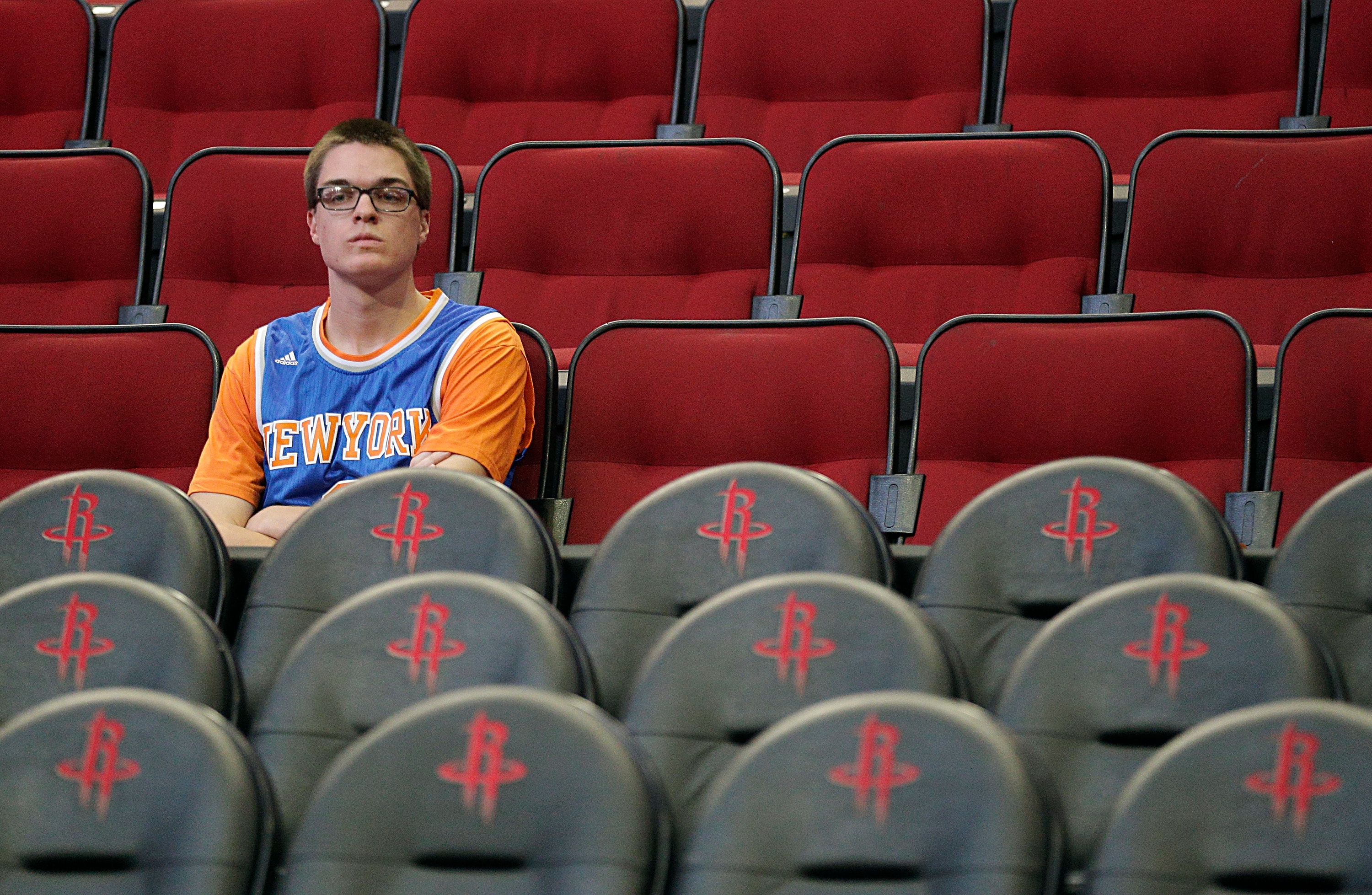 Nov 25, 2017; Houston, TX, USA; A New York Knicks fan watches warm up before the Knicks play against the Houston Rockets a-USA TODAY Sports / Thomas Shea
