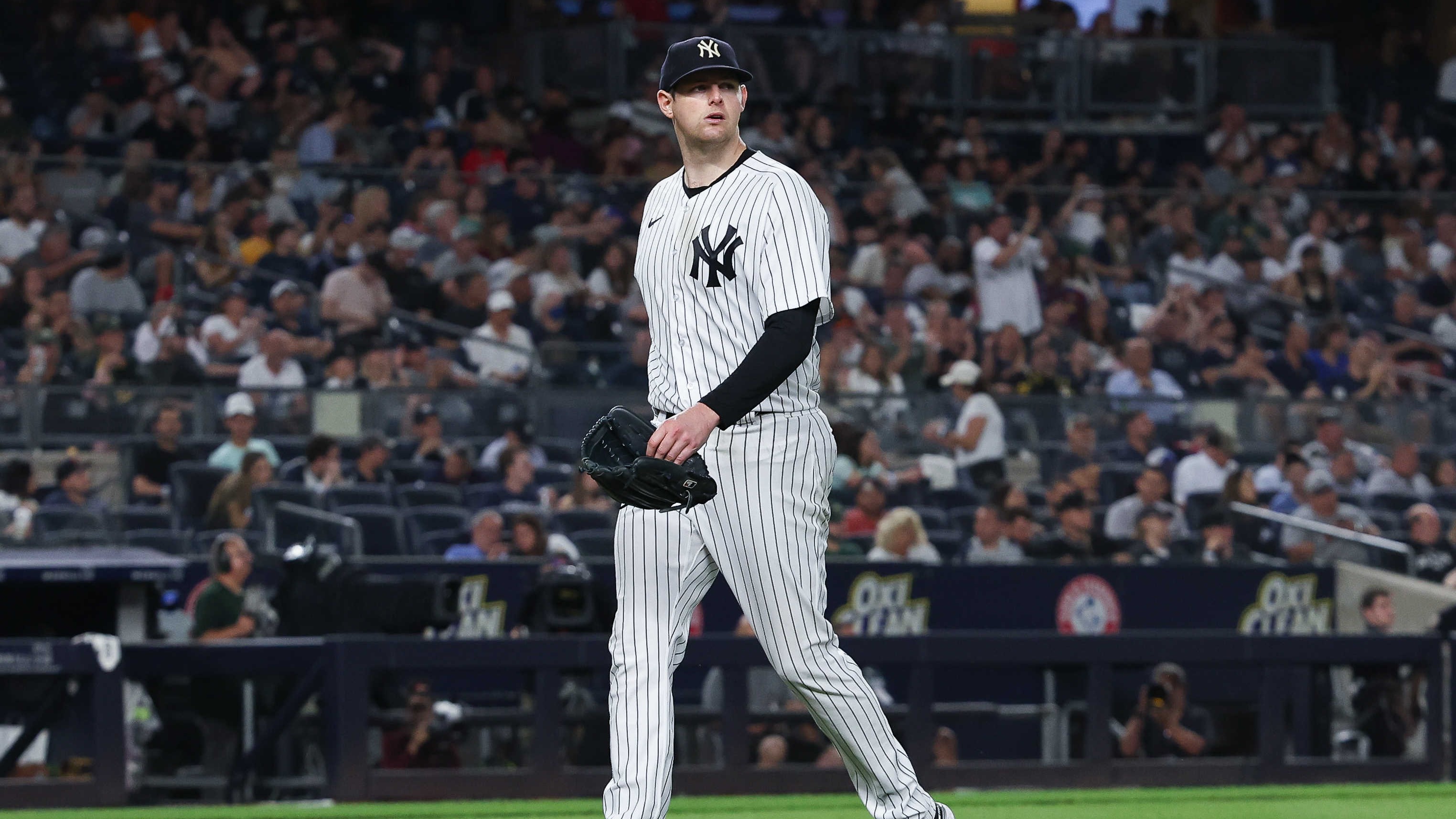 New York Yankees starting pitcher Jordan Montgomery (47) looks back while walking off the field during the seventh inning against the Oakland Athletics at Yankee Stadium. / Vincent Carchietta-USA TODAY Sports