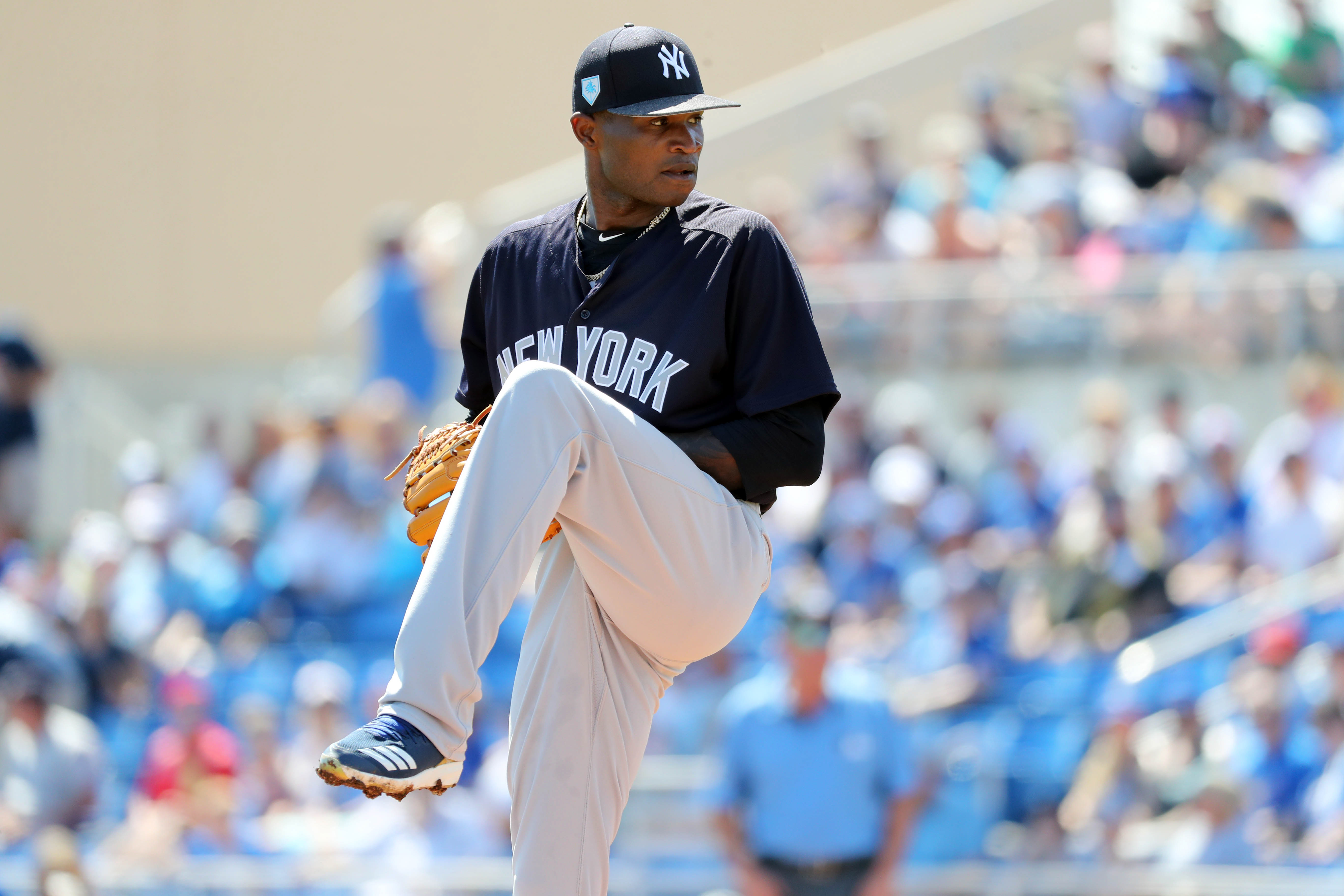 New York Yankees relief pitcher Domingo German throws a pitch during the first inning against the Toronto Blue Jays at Dunedin Stadium. / Kim Klement/USA TODAY Sports