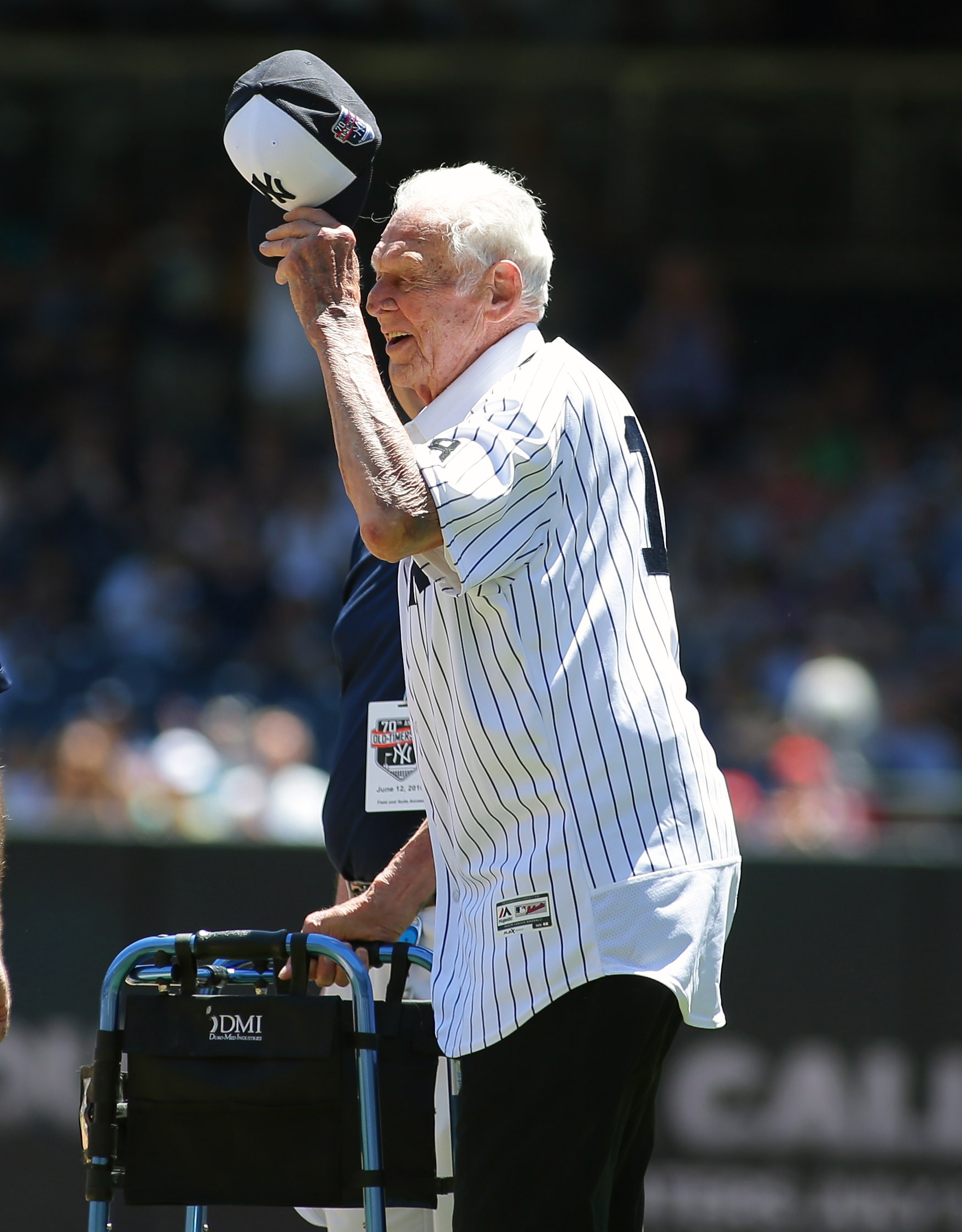 Jun 12, 2016; Bronx, NY, USA; Former New York Yankees pitcher Don Larsen waves to the fans during the Old Timers Day ceremony prior to the game between the Detroit Tigers and New York Yankees at Yankee Stadium. Mandatory Credit: Andy Marlin-USA TODAY Sports / Andy Marlin
