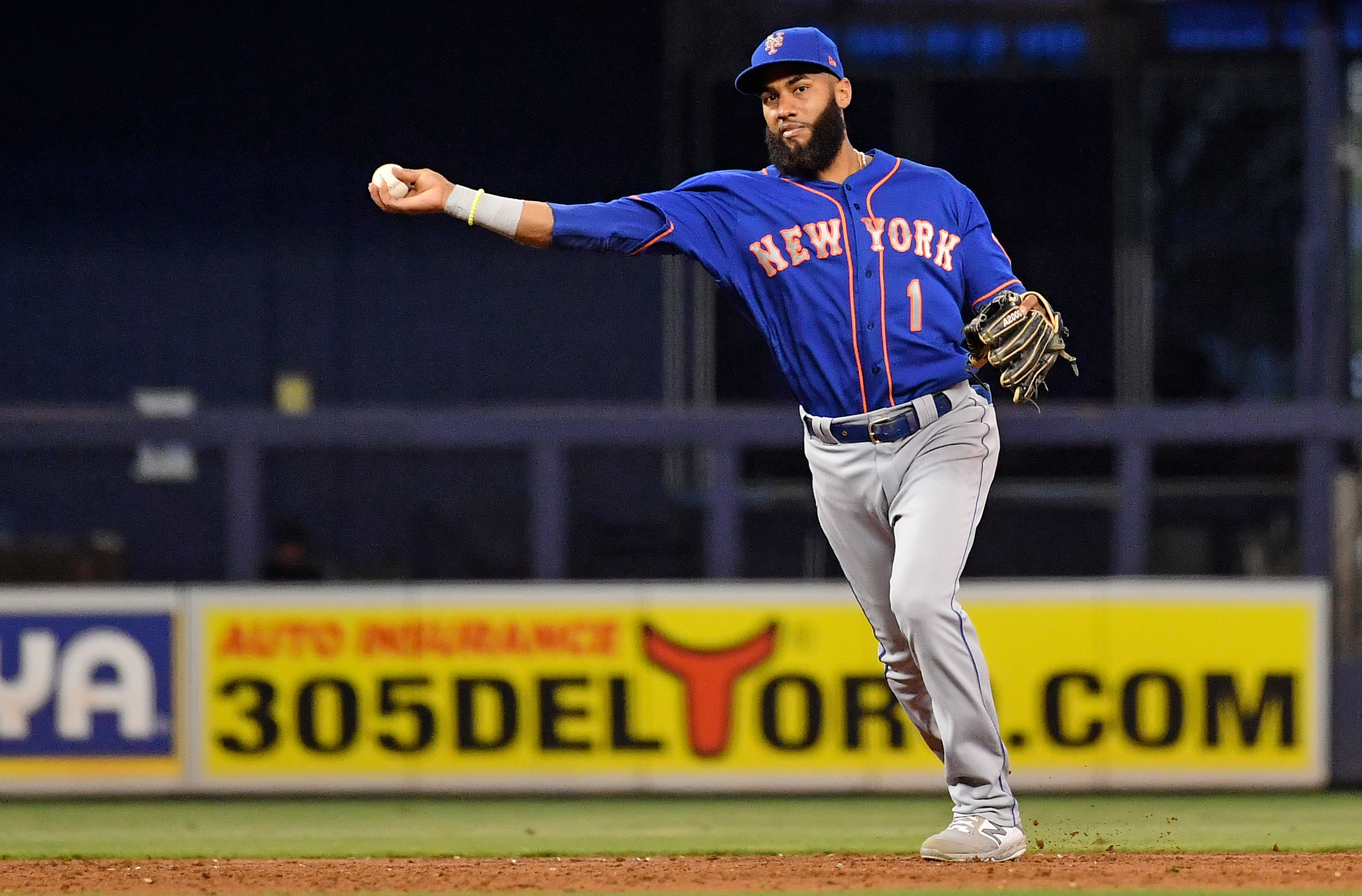 Jul 13, 2019; Miami, FL, USA; New York Mets shortstop Amed Rosario (1) throws out a Miami Marlins base runner in the third inning at Marlins Park. Mandatory Credit: Jasen Vinlove-USA TODAY Sports / Jasen Vinlove