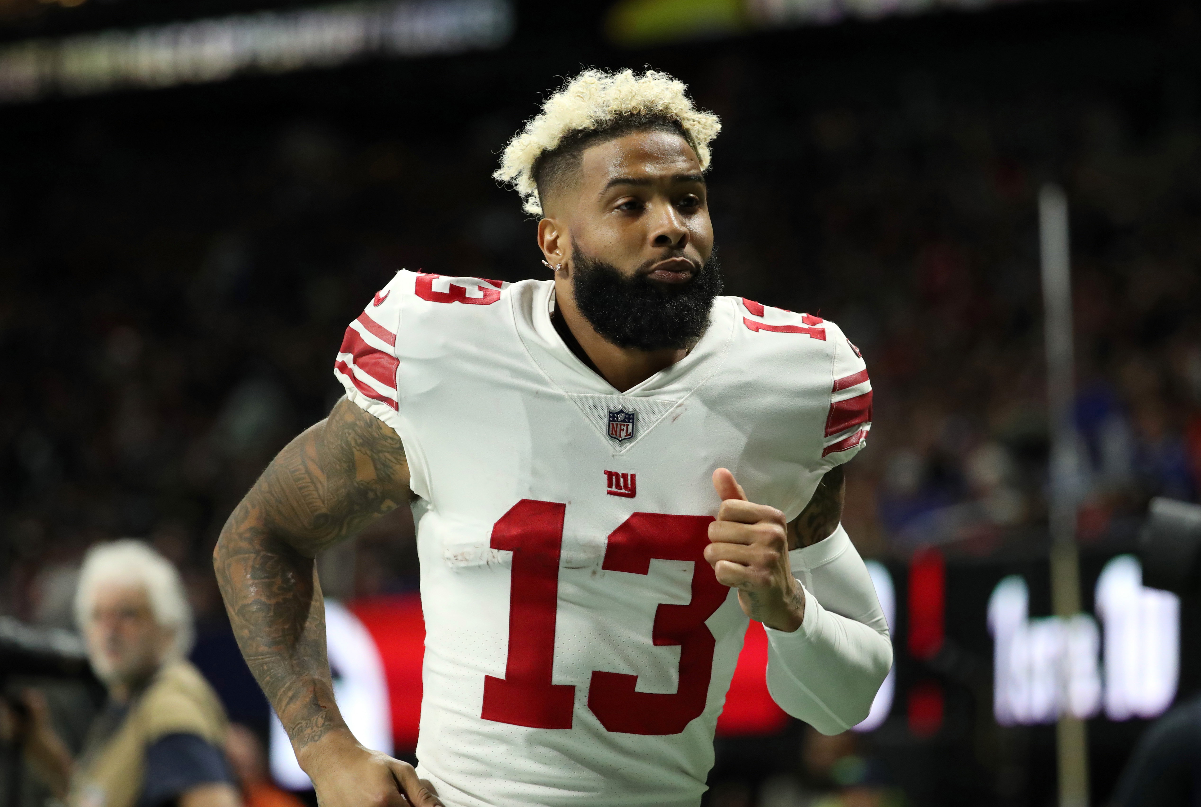 Oct 22, 2018; Atlanta, GA, USA; New York Giants wide receiver Odell Beckham (13) runs to the locker room during the fourth quarter against the Atlanta Falcons at Mercedes-Benz Stadium. Mandatory Credit: Jason Getz-USA TODAY Sports / Jason Getz