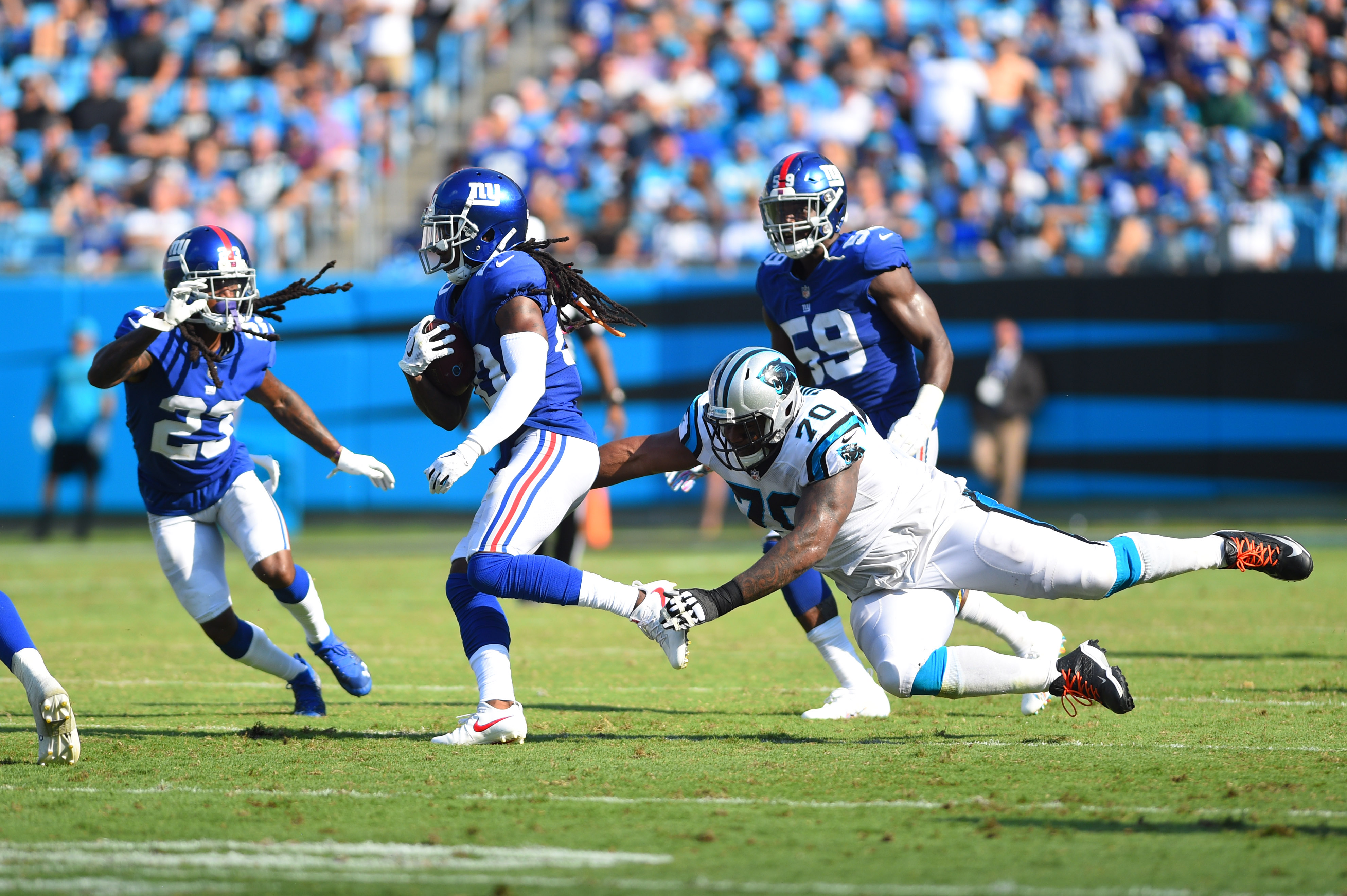 Oct 7, 2018; Charlotte, NC, USA; New York Giants cornerback Janoris Jenkins (20) with an interception as cornerback B.W. Webb (23) looks on and Carolina Panthers offensive guard Trai Turner (70) defends in the fourth quarter at Bank of America Stadium. Mandatory Credit: Bob Donnan-USA TODAY Sports / Bob Donnan