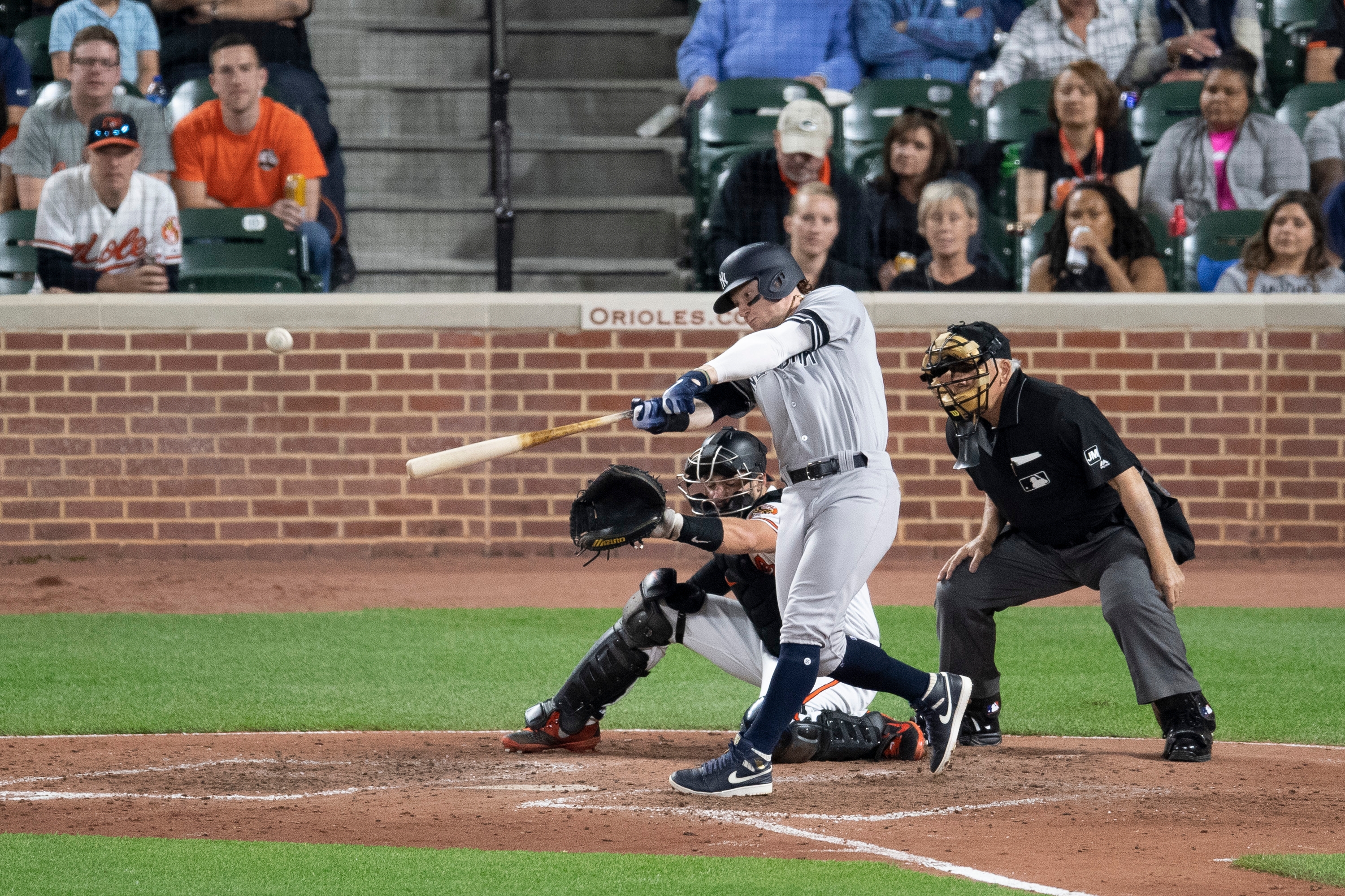 New York Yankees right fielder Clint Frazier hits a three-run home run during the fifth inning against the Baltimore Orioles at Oriole Park at Camden Yards. / Tommy Gilligan/USA TODAY Sports