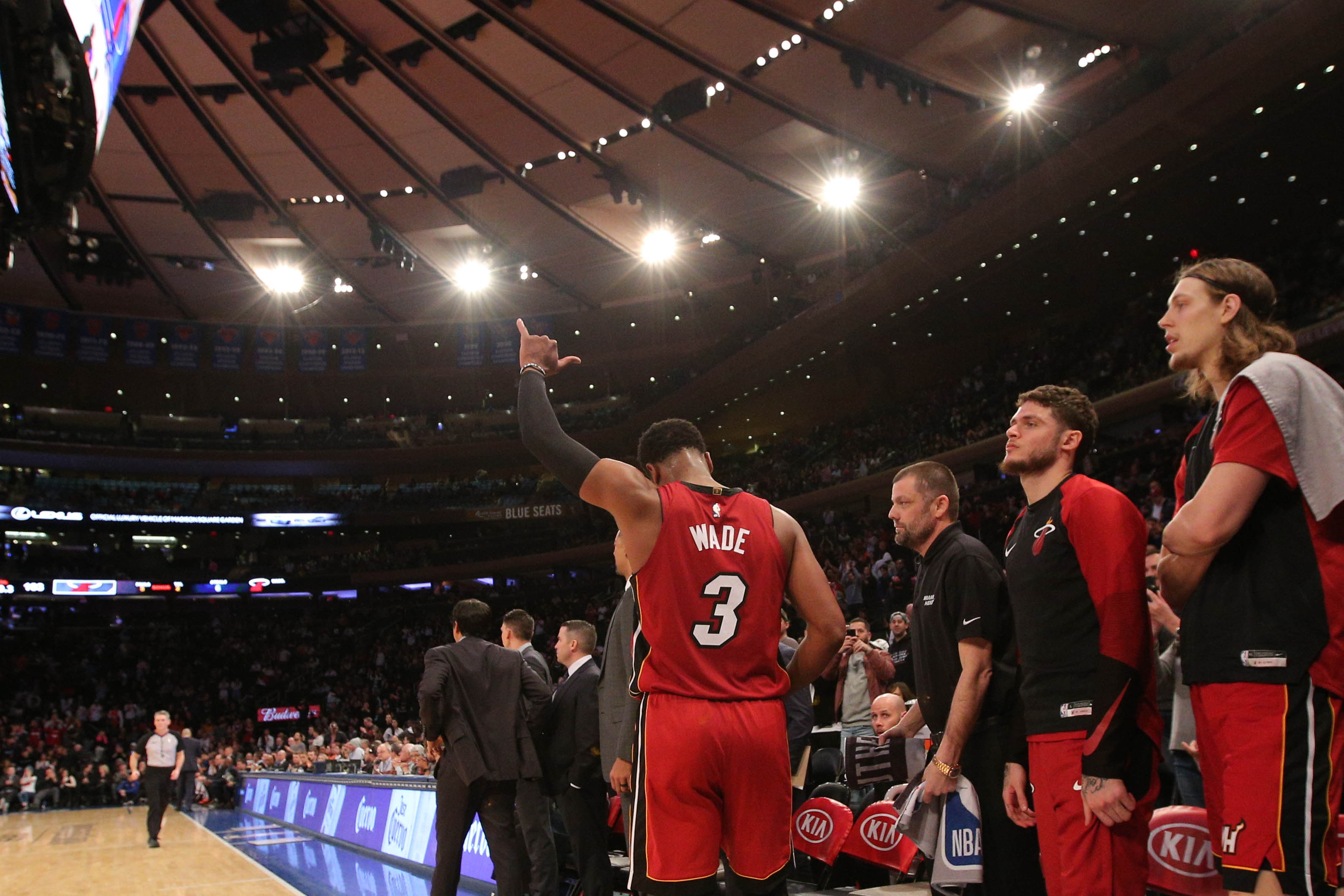 Jan 27, 2019; New York, NY, USA; Miami Heat guard Dwayne Wade (3) reacts to fans chanting "let's go Heat" during the fourth quarter against the New York Knicks at Madison Square Garden. Mandatory Credit: Brad Penner-USA TODAY Sports / Brad Penner