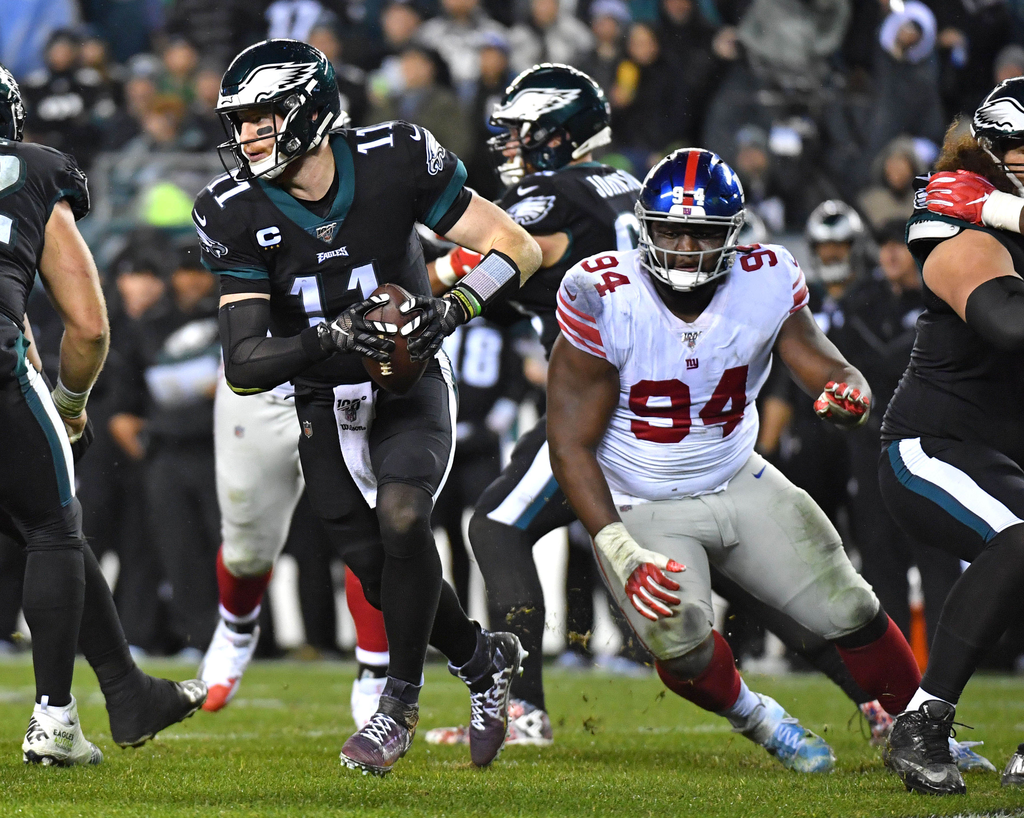 Dec 9, 2019; Philadelphia, PA, USA; Philadelphia Eagles quarterback Carson Wentz (11) roles away from pressure from New York Giants defensive end Dalvin Tomlinson (94) during the second quarter at Lincoln Financial Field. Mandatory Credit: Eric Hartline-USA TODAY Sports / Eric Hartline