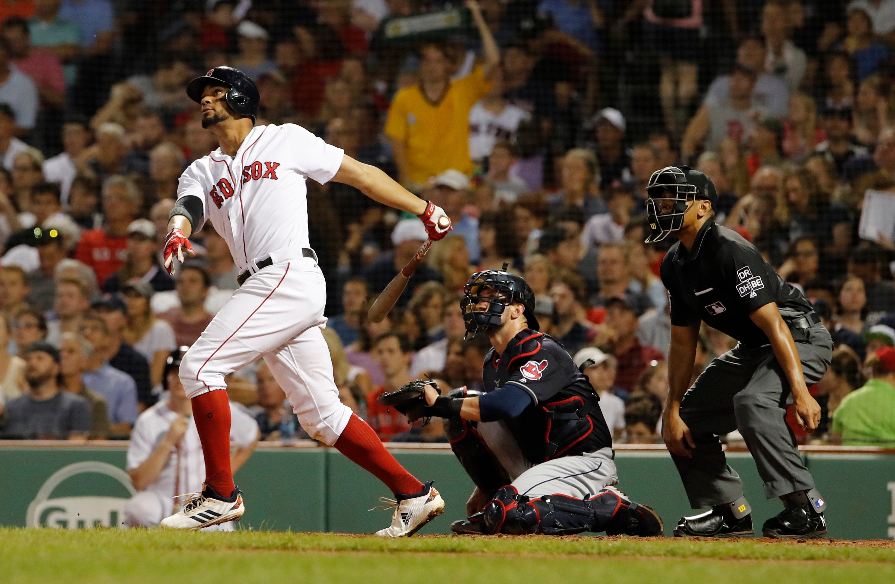 Aug 22, 2018; Boston, MA, USA; Boston Red Sox shortstop Xander Bogaerts (2) hits a home run against the Cleveland Indians in the fourth inning at Fenway Park. Mandatory Credit: David Butler II-USA TODAY Sports / David Butler II