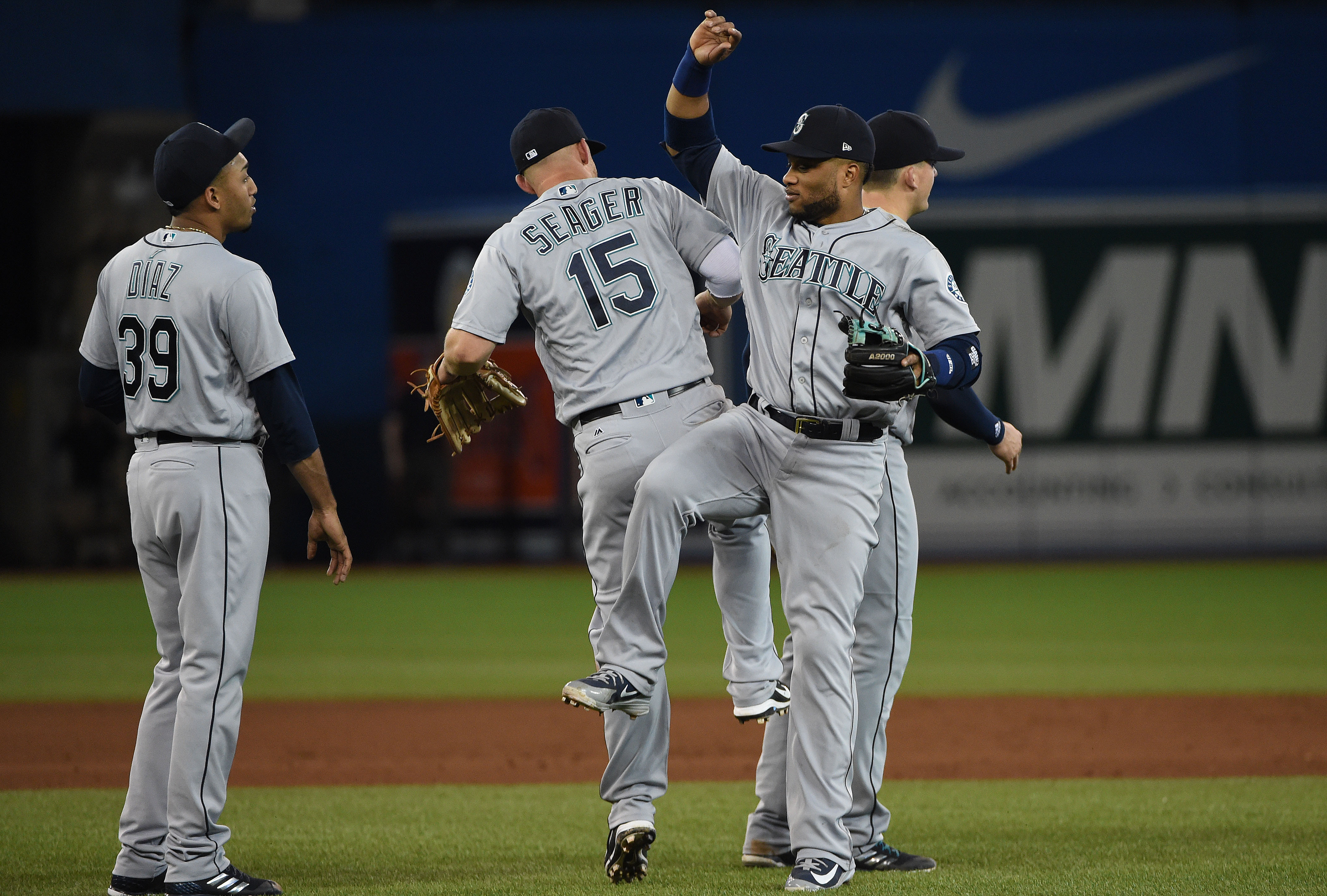 May 10, 2018; Toronto, Ontario, CAN; Seattle Mariners second baseman Robinson Cano (22) bumps into third baseman Kyle Seager (15) as they celebrate with relief pitcher Edwin Diaz (39) after a win over Toronto Blue Jays at Rogers Centre. Mandatory Credit: Dan Hamilton-USA TODAY Sports / Dan Hamilton