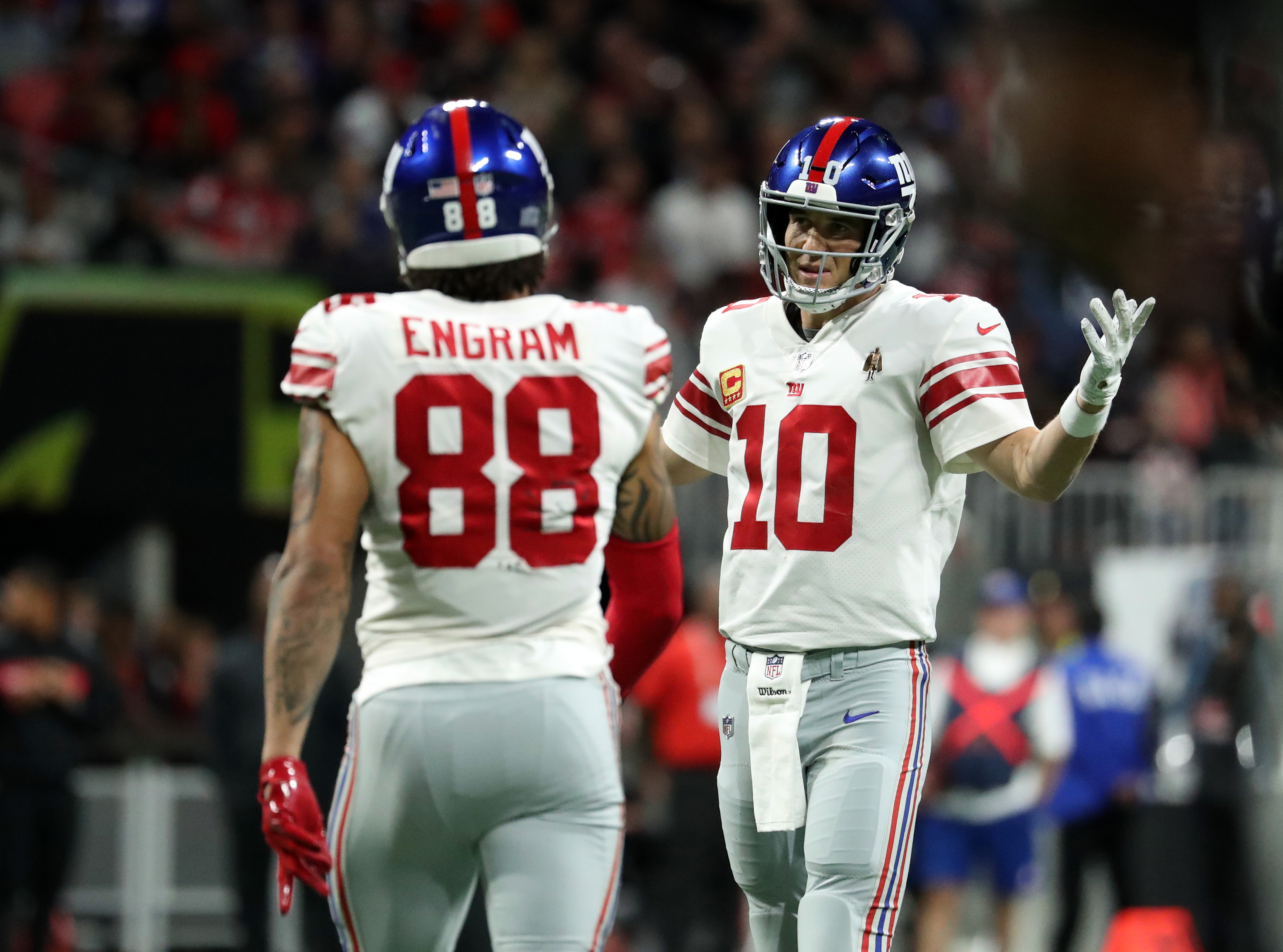 Oct 22, 2018; Atlanta, GA, USA; New York Giants quarterback Eli Manning (10) talks with tight end Evan Engram (88) after an incomplete pass in the third quarter against the Atlanta Falcons at Mercedes-Benz Stadium. Mandatory Credit: Jason Getz-USA TODAY Sports / Jason Getz