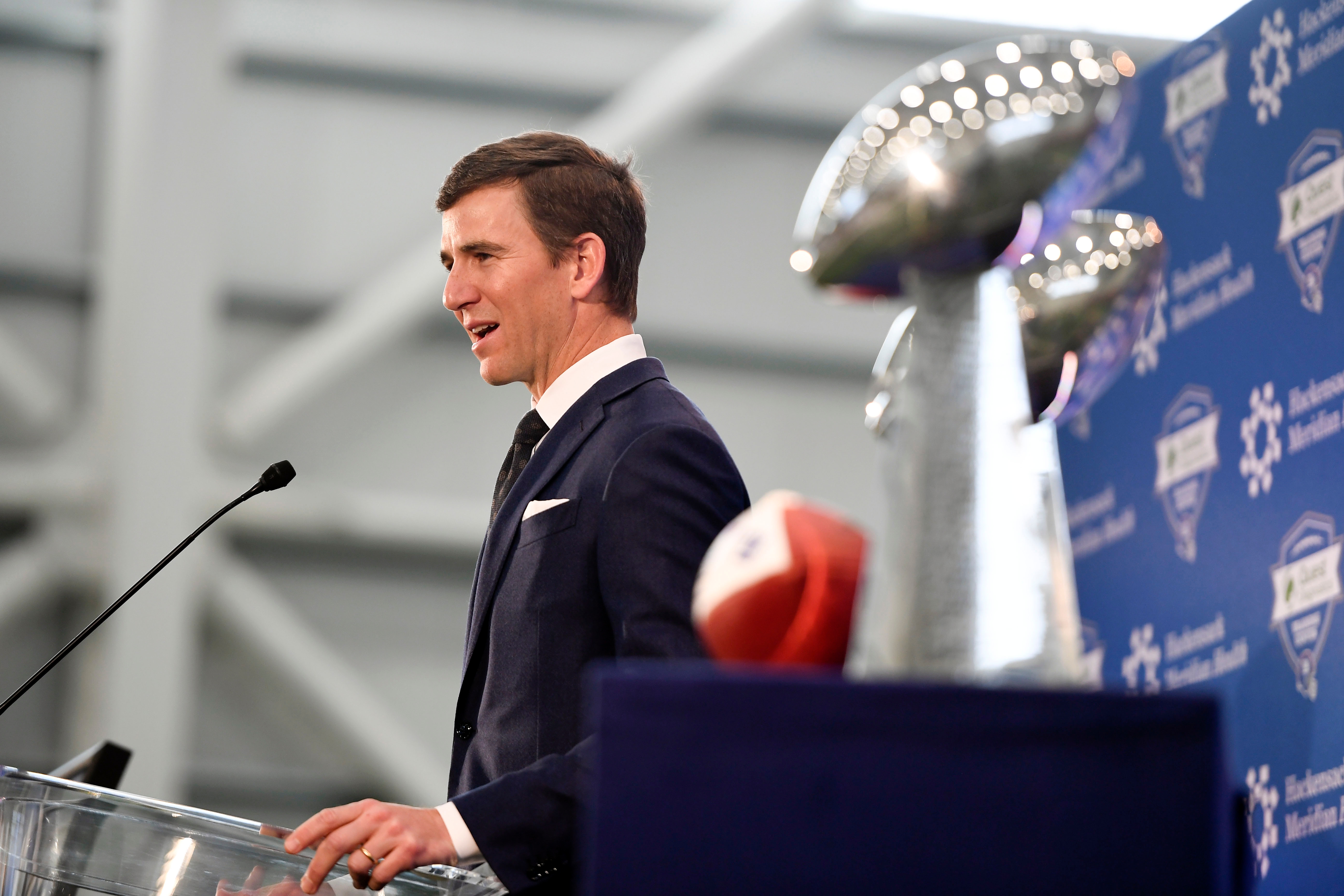 Jan 24, 2020; East Rutherford, New Jersey, USA; New York Giants quarterback Eli Manning answers questions with the two Vince Lombardi trophies he won for the Giants on display during a press conference at Quest Diagnostics Training Center. Mandatory Credit: Danielle Parhizkaran-USA TODAY Sports / Danielle Parhizkaran