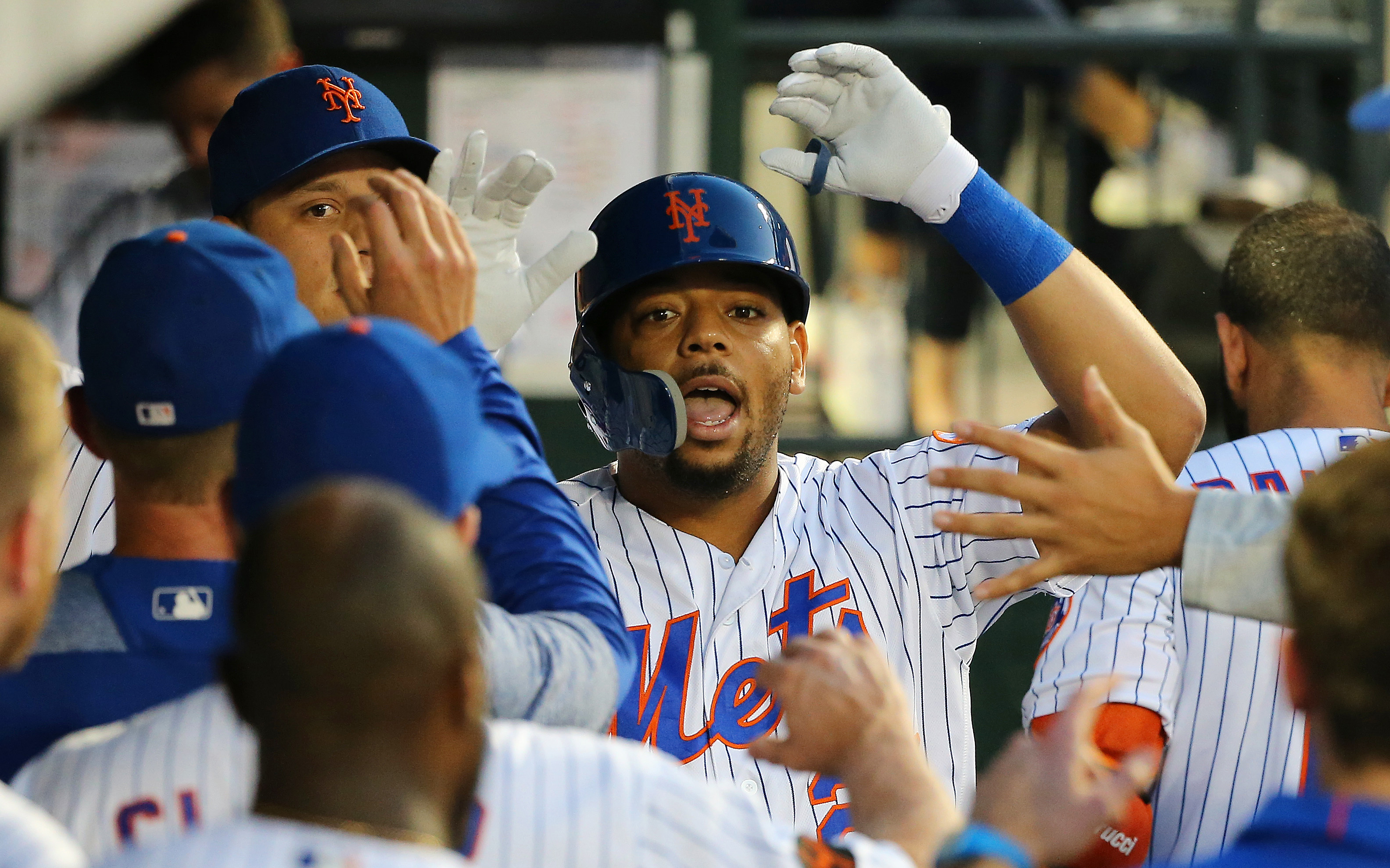 Aug 22, 2018; New York City, NY, USA; New York Mets first baseman Dominic Smith (22) is congratulated after hitting a solo home run against the San Francisco Giants during the second inning at Citi Field. Mandatory Credit: Andy Marlin-USA TODAY Sports / Andy Marlin