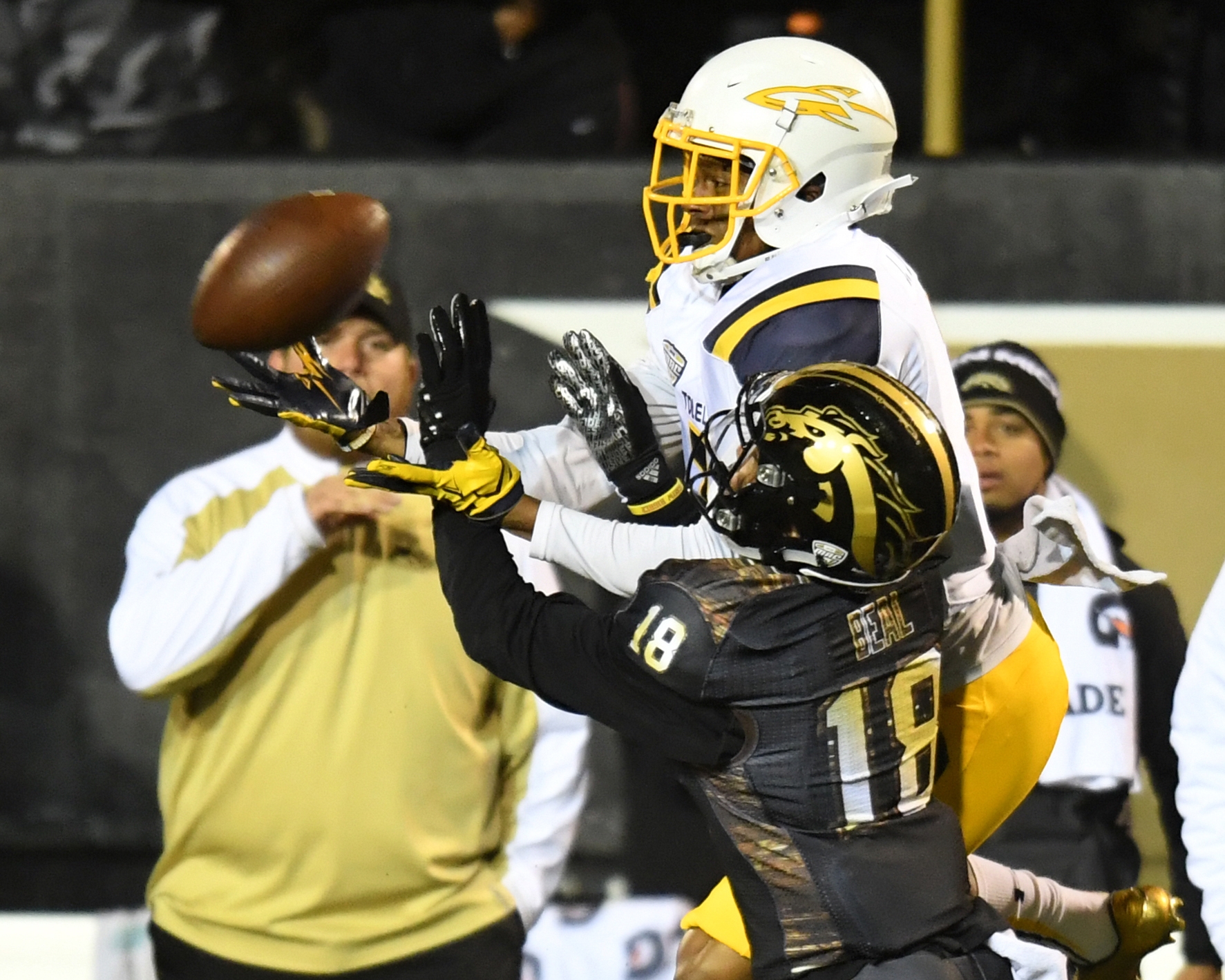 Nov 25, 2016; Kalamazoo, MI, USA; Pass interference is called against Western Michigan Broncos defensive back Sam Beal (18) defending a pass intended for Toledo Rockets wide receiver Jon'Vea Johnson (7) during the first half at Waldo Stadium. Mandatory Credit: Patrick Gorski-USA TODAY Sports / Patrick Gorski