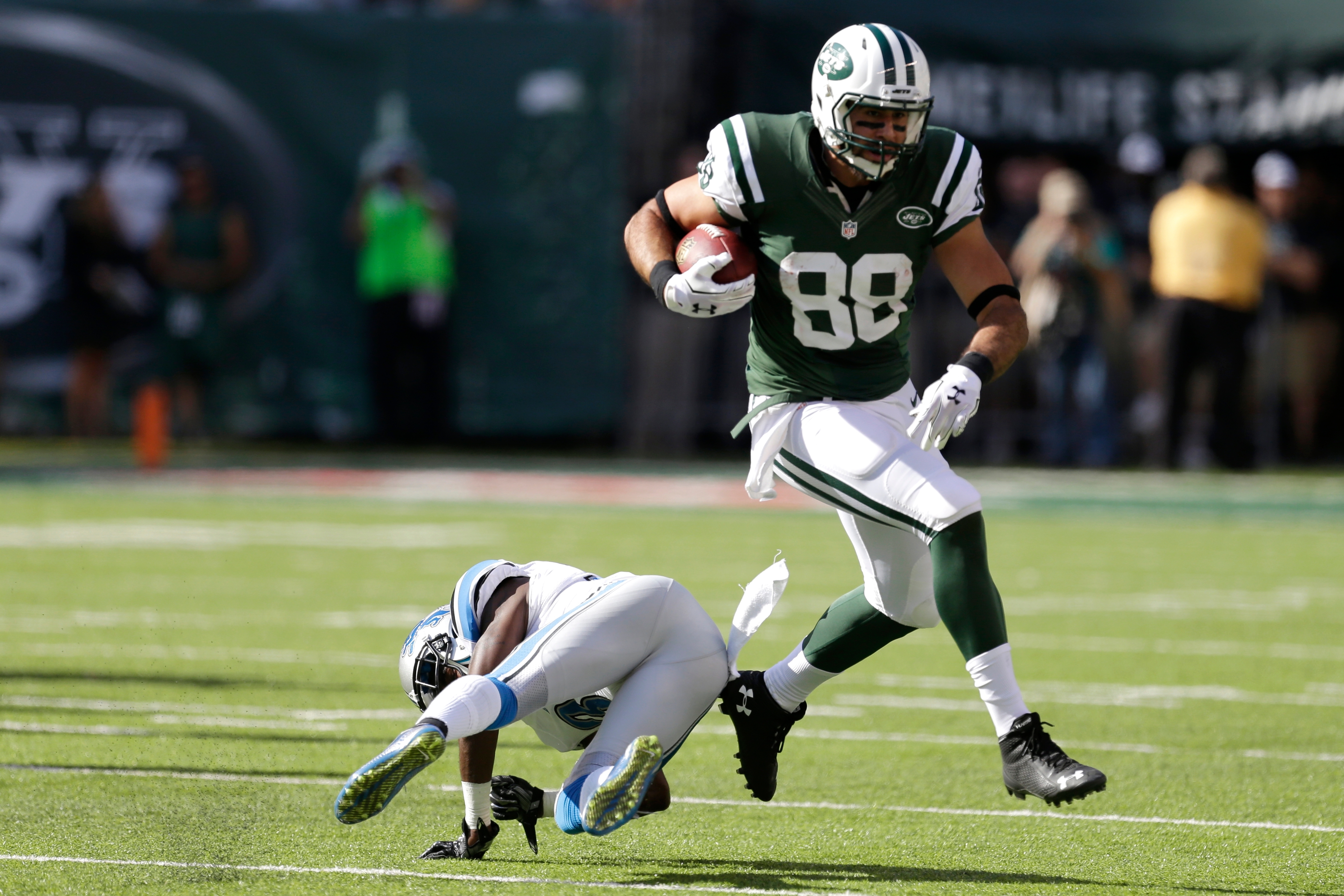 New York Jets tight end Jace Amaro (88) avoids a tackle by Detroit Lions defensive back Danny Gorrer (36) during the second half of an NFL football game, Sunday, Sept. 28, 2014, in East Rutherford, N.J. (AP Photo/Frank Franklin II) / Frank Franklin II/AP