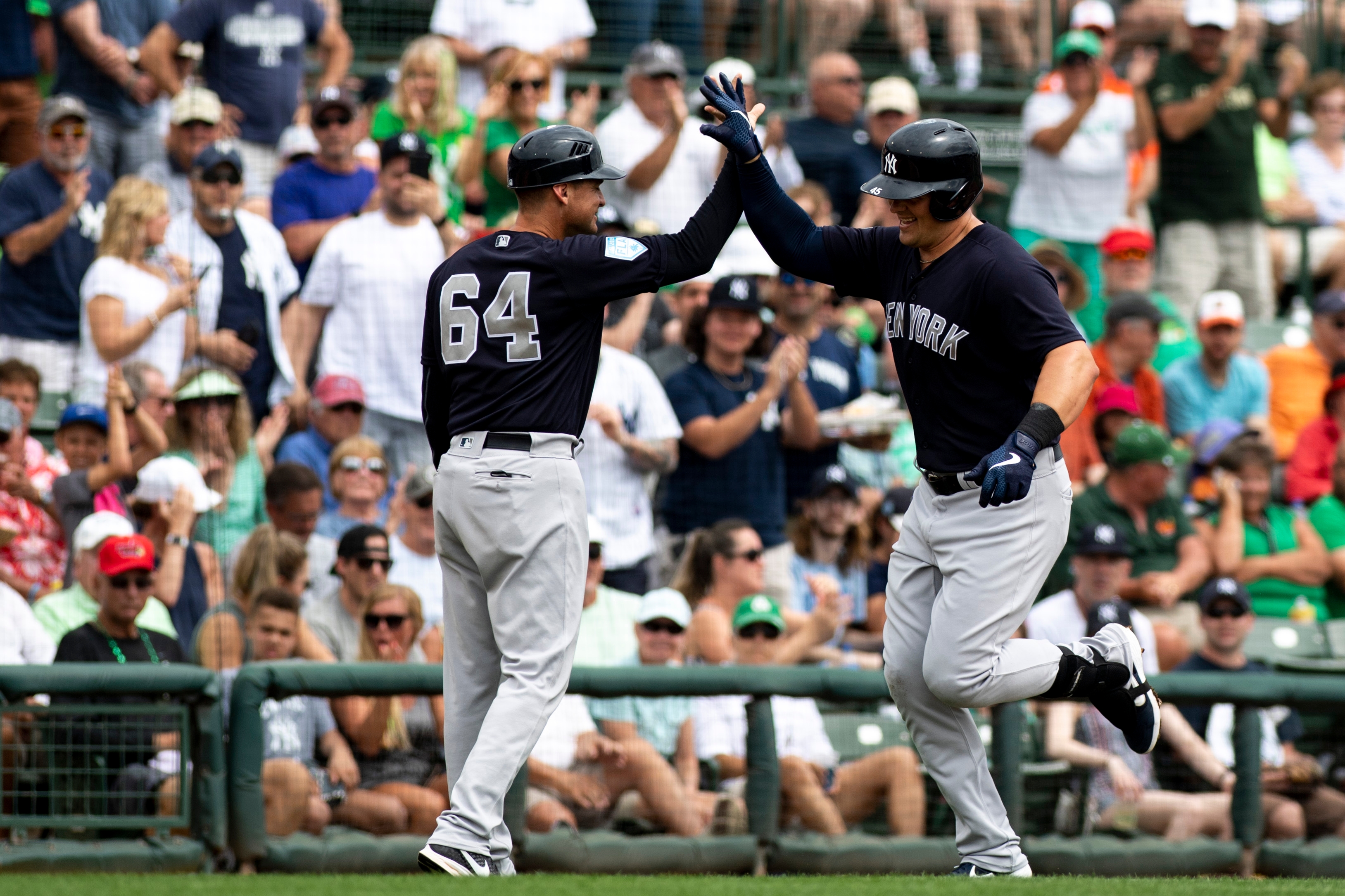 Mar 17, 2019; Sarasota, FL, USA; New York Yankees infielder Luke Voit (45) is congratulated by third base coach Carlos Mendoza (64) after hitting a two run homer during the first inning against the Baltimore Orioles at Ed Smith Stadium. Mandatory Credit: Douglas DeFelice-USA TODAY Sports / Douglas DeFelice
