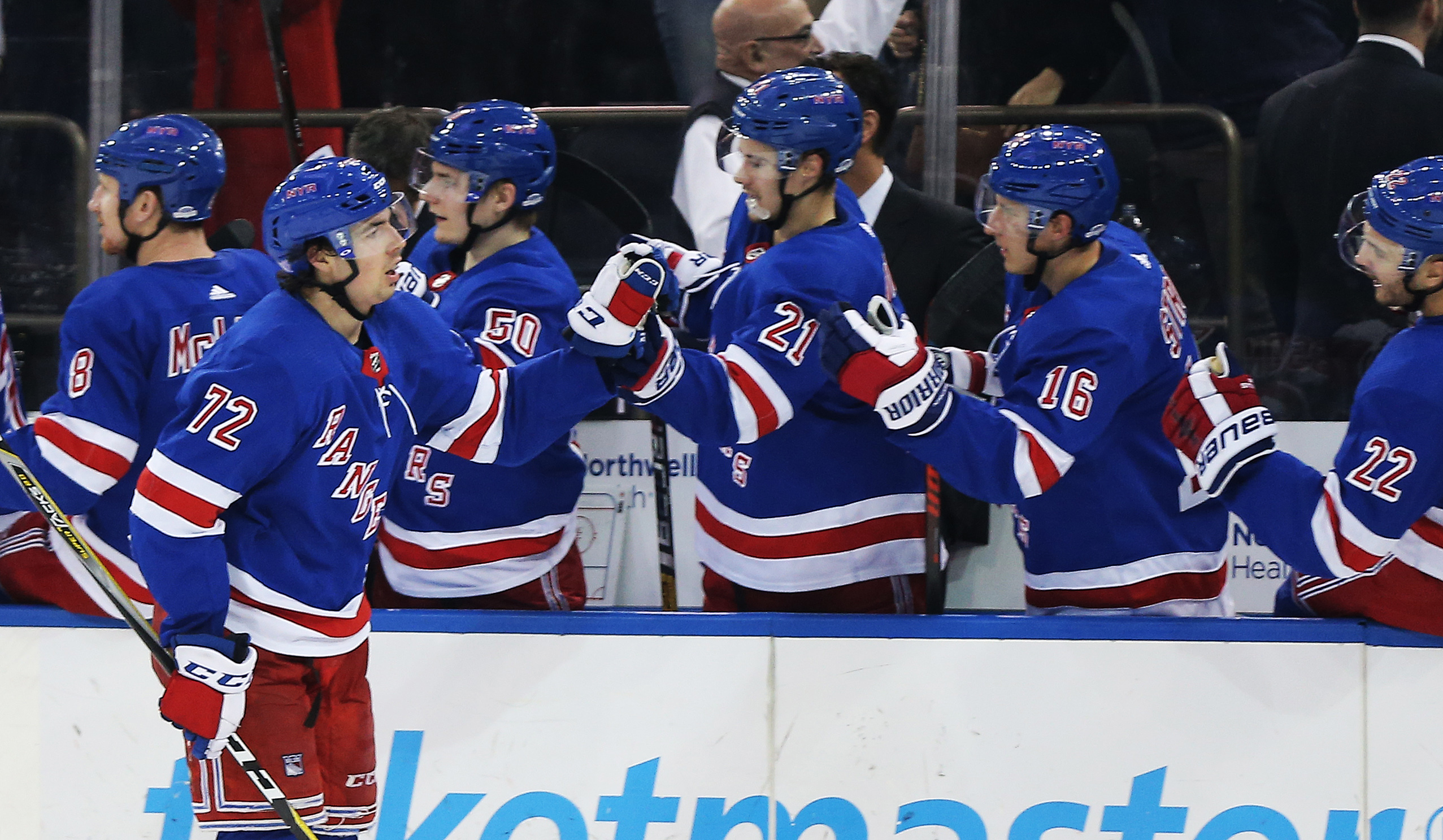 Nov 19, 2018; New York, NY, USA; New York Rangers center Filip Chytil (72) is congratulated after scoring the winning goal against the Dallas Stars during the third period at Madison Square Garden. Mandatory Credit: Andy Marlin-USA TODAY Sports / Andy Marlin