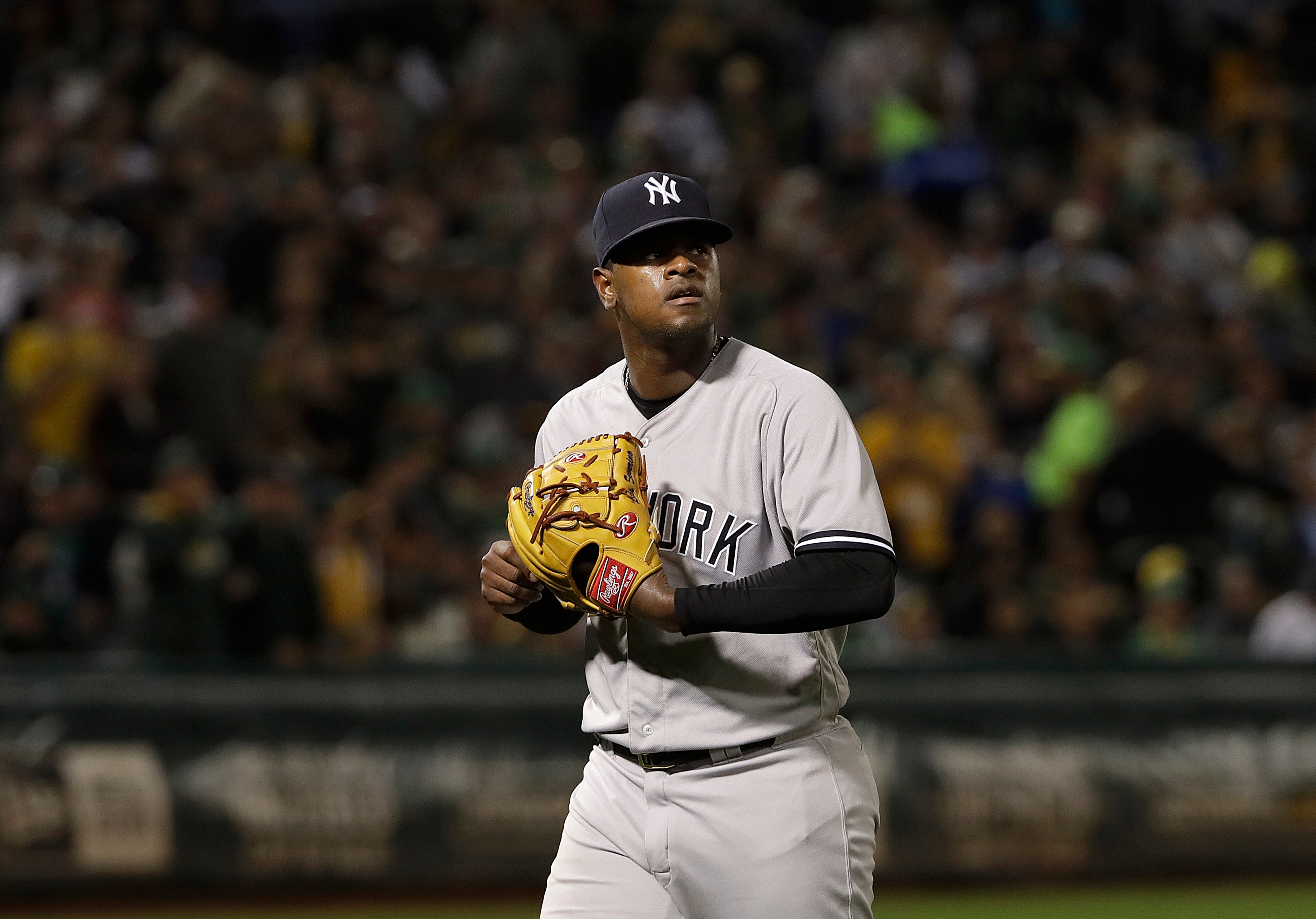 New York Yankees pitcher Luis Severino walks toward the dugout after being relieved during the third inning of a baseball game against the Oakland Athletics in Oakland, Calif., Wednesday, Sept. 5, 2018. (AP Photo/Jeff Chiu) / AP