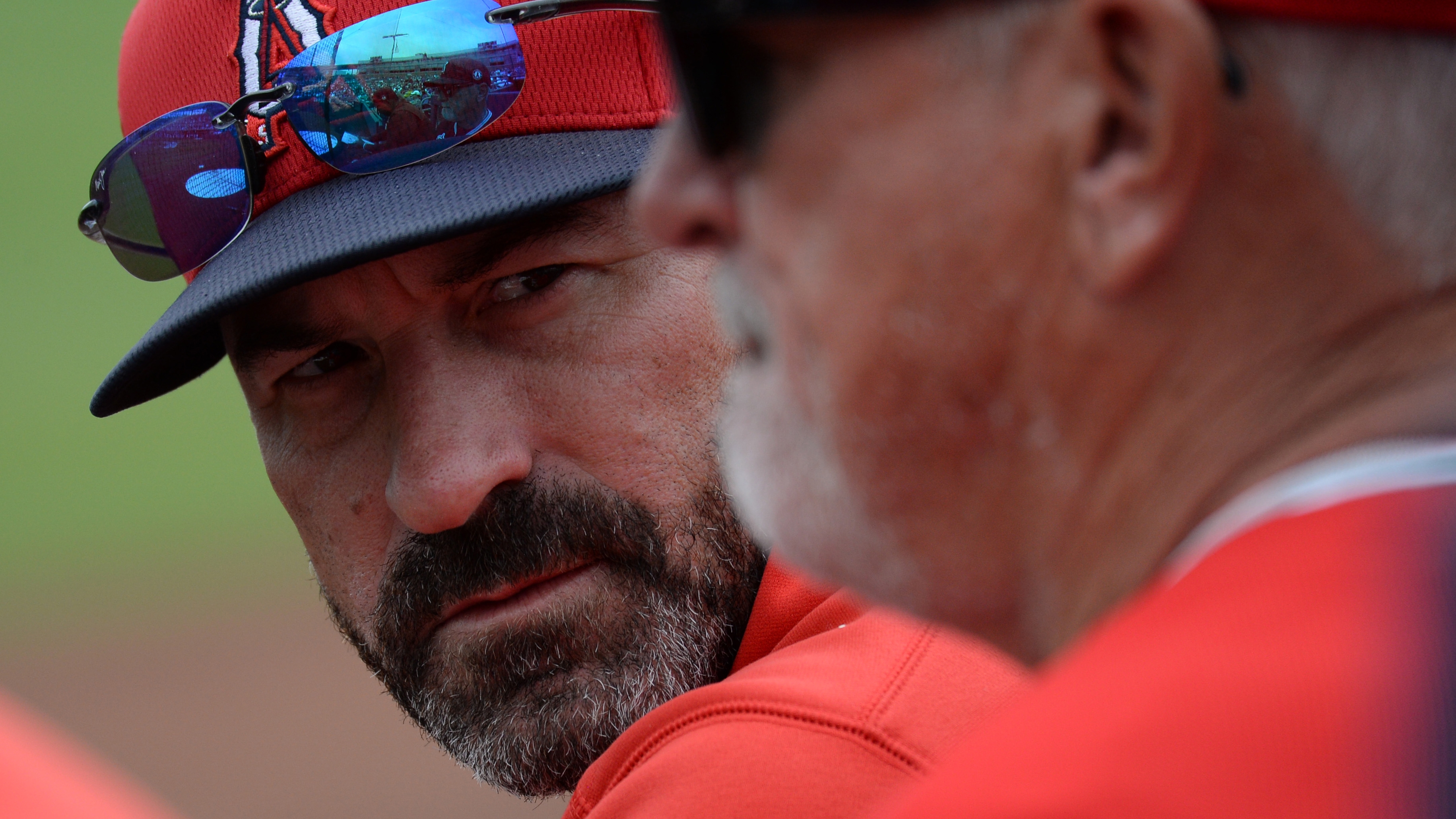 Mar 10, 2020; Peoria, Arizona, USA; Los Angeles Angels pitching coach Mickey Callaway (left) talks with manager Joe Maddon during the second inning of a spring training game against the Seattle Mariners at Peoria Stadium. / Joe Camporeale-USA TODAY Sports