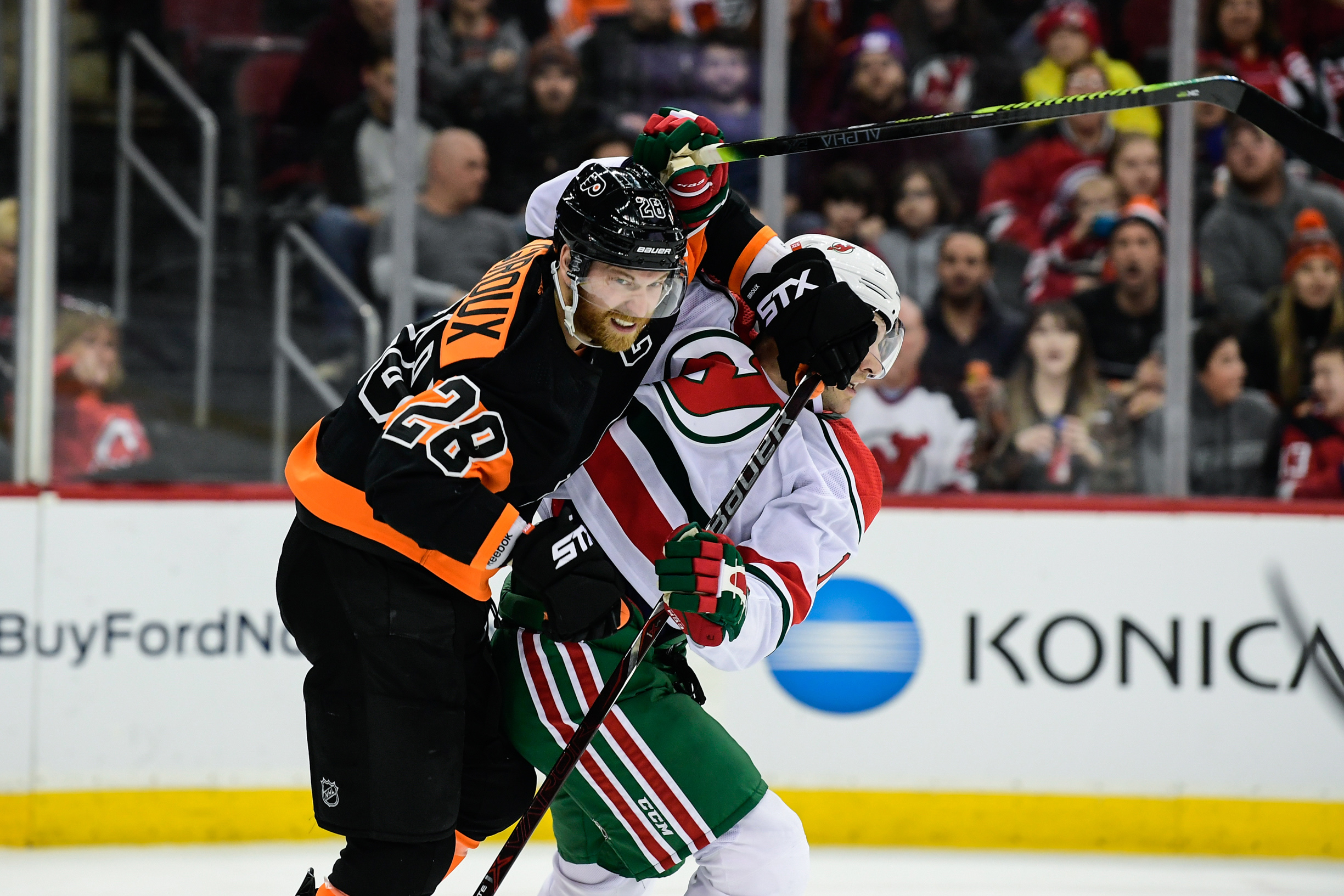 Mar 1, 2019; Newark, NJ, USA; Philadelphia Flyers center Claude Giroux (28) battles with New Jersey Devils left wing Kenny Agostino (17) during the second period at Prudential Center. Mandatory Credit: Catalina Fragoso-USA TODAY Sports / Catalina Fragoso