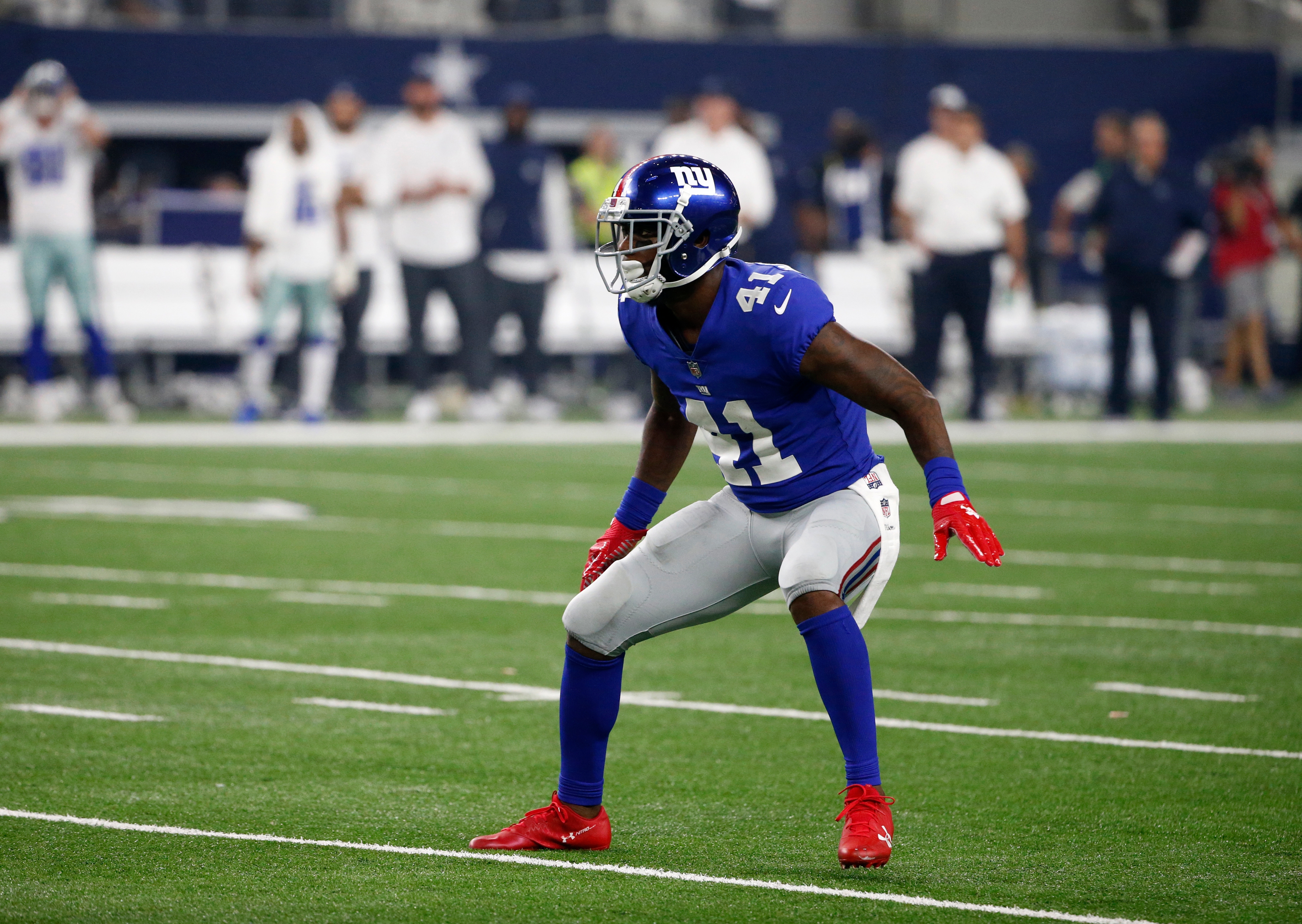 New York Giants cornerback Dominique Rodgers-Cromartie (41) defends against the Dallas Cowboys during an NFL football game, Sunday, Sept. 10, 2017, in Arlington, Texas. (AP Photo/Michael Ainsworth) / AP