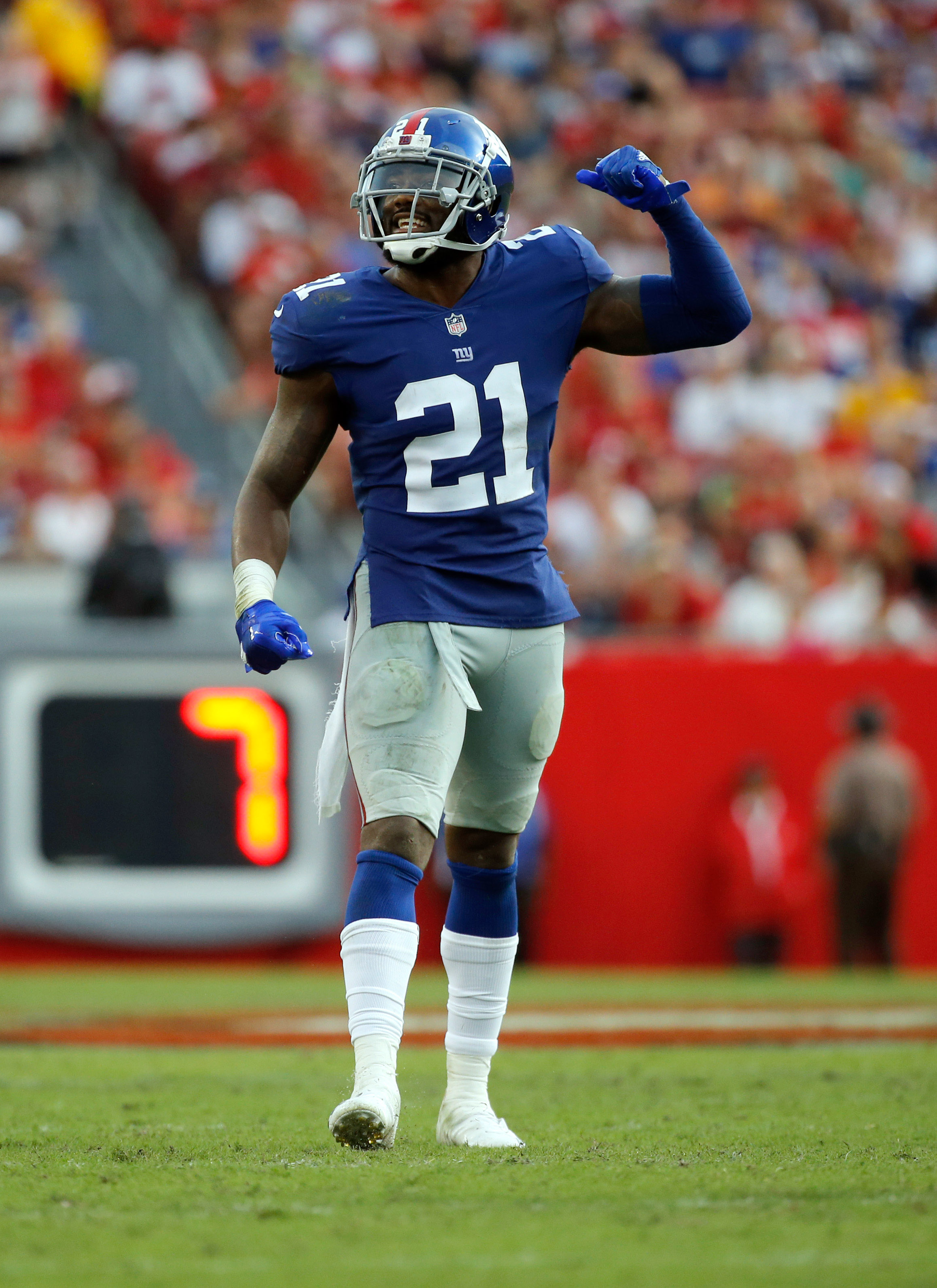 New York Giants strong safety Landon Collins calls a play against the Tampa Bay Buccaneers during the second half at Raymond James Stadium. / Kim Klement/USA TODAY Sports