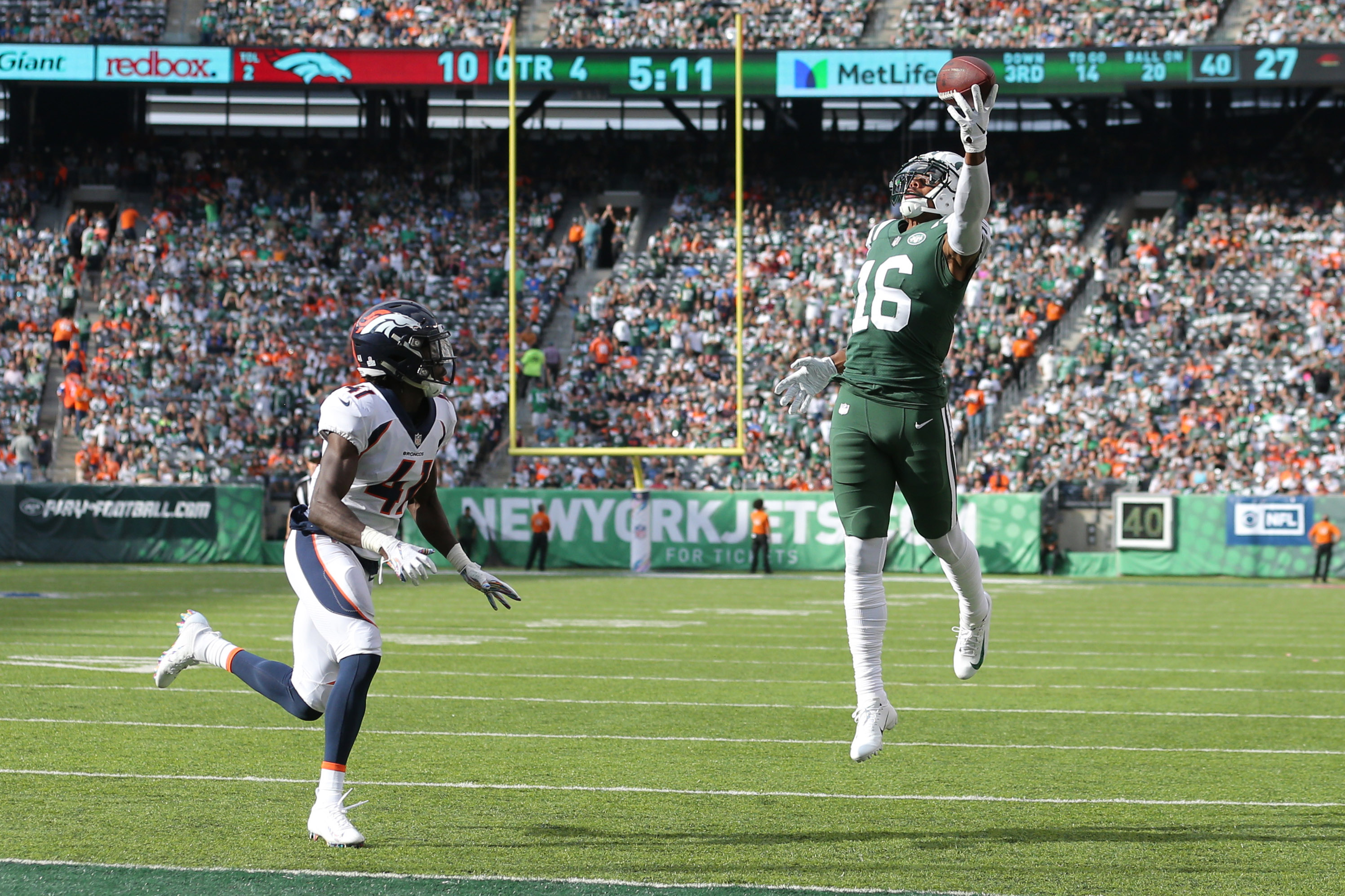 Oct 7, 2018; East Rutherford, NJ, USA; New York Jets wide receiver Terrelle Pryor (16) catches a touchdown pass against Denver Broncos cornerback Isaac Yiadom (41) during the fourth quarter at MetLife Stadium. Mandatory Credit: Brad Penner-USA TODAY Sports / Brad Penner