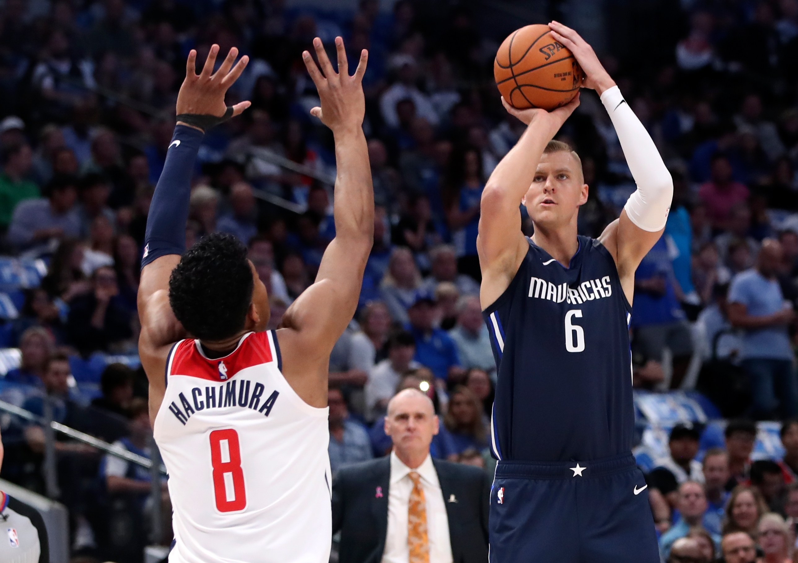 Oct 23, 2019; Dallas, TX, USA; Dallas Mavericks forward Kristaps Porzingis (6) shoots over Washington Wizards forward Rui Hachimura (8) during the first quarter at American Airlines Center. Mandatory Credit: Kevin Jairaj-USA TODAY Sports / Kevin Jairaj