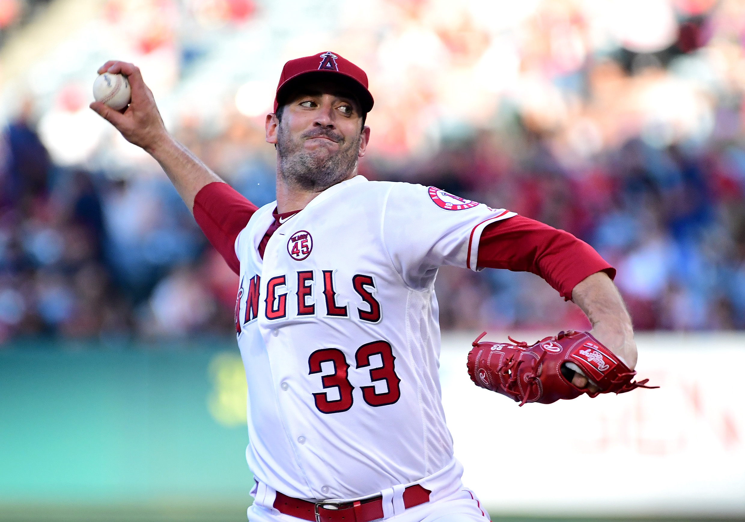 Jul 18, 2019; Anaheim, CA, USA; Los Angeles Angels starting pitcher Matt Harvey (33) pitches against the Houston Astros in the third inning at Angel Stadium of Anaheim. Mandatory Credit: Jayne Kamin-Oncea-USA TODAY Sports / Jayne Kamin-Oncea