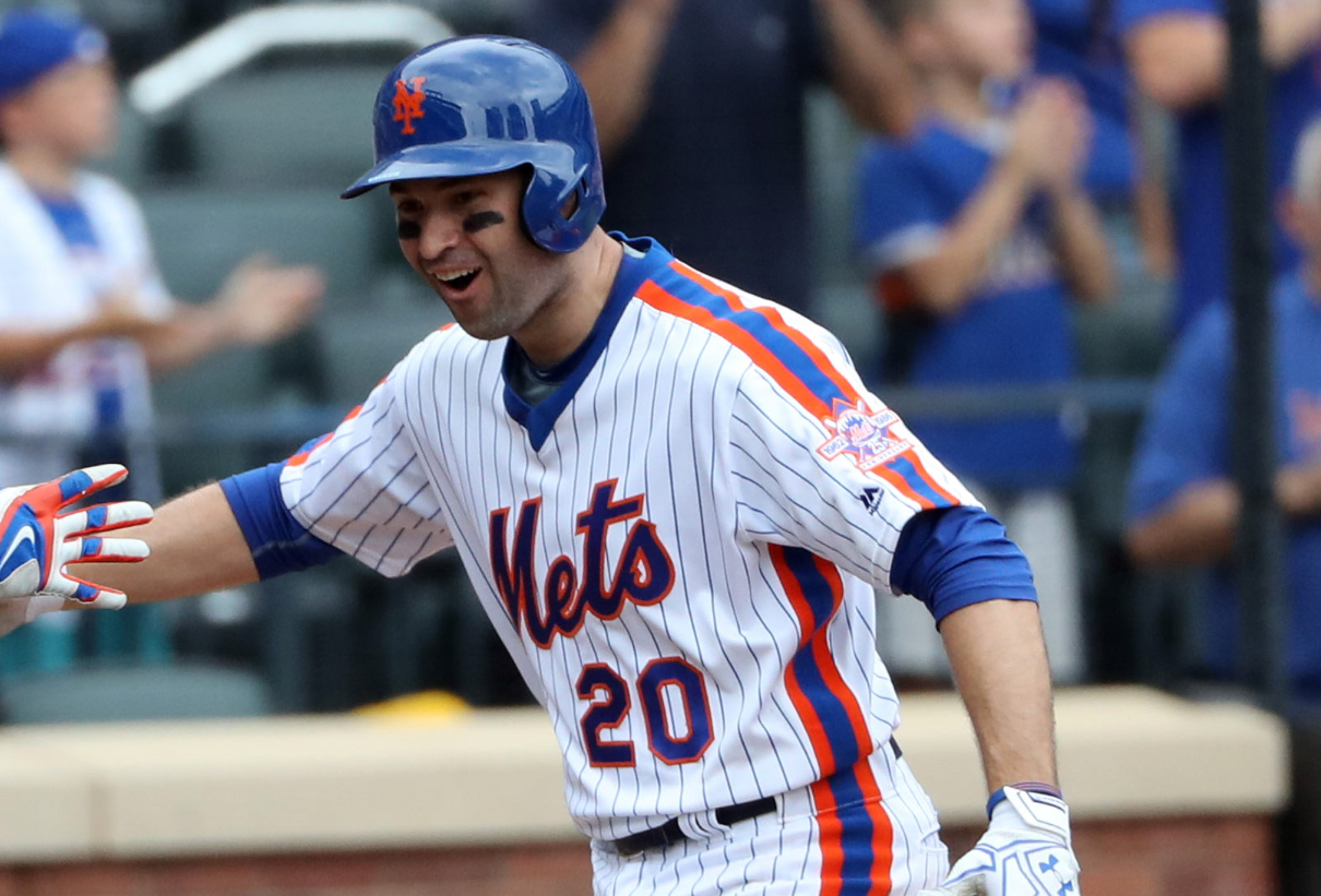 Jul 31, 2016; New York City, NY, USA; New York Mets second baseman Neil Walker (20) celebrates his three run home run with first baseman James Loney (28) during the seventh inning against the Colorado Rockies at Citi Field. New York Mets won 6-4. Mandatory Credit: Anthony Gruppuso-USA TODAY Sports / Anthony Gruppuso-USA TODAY Sports