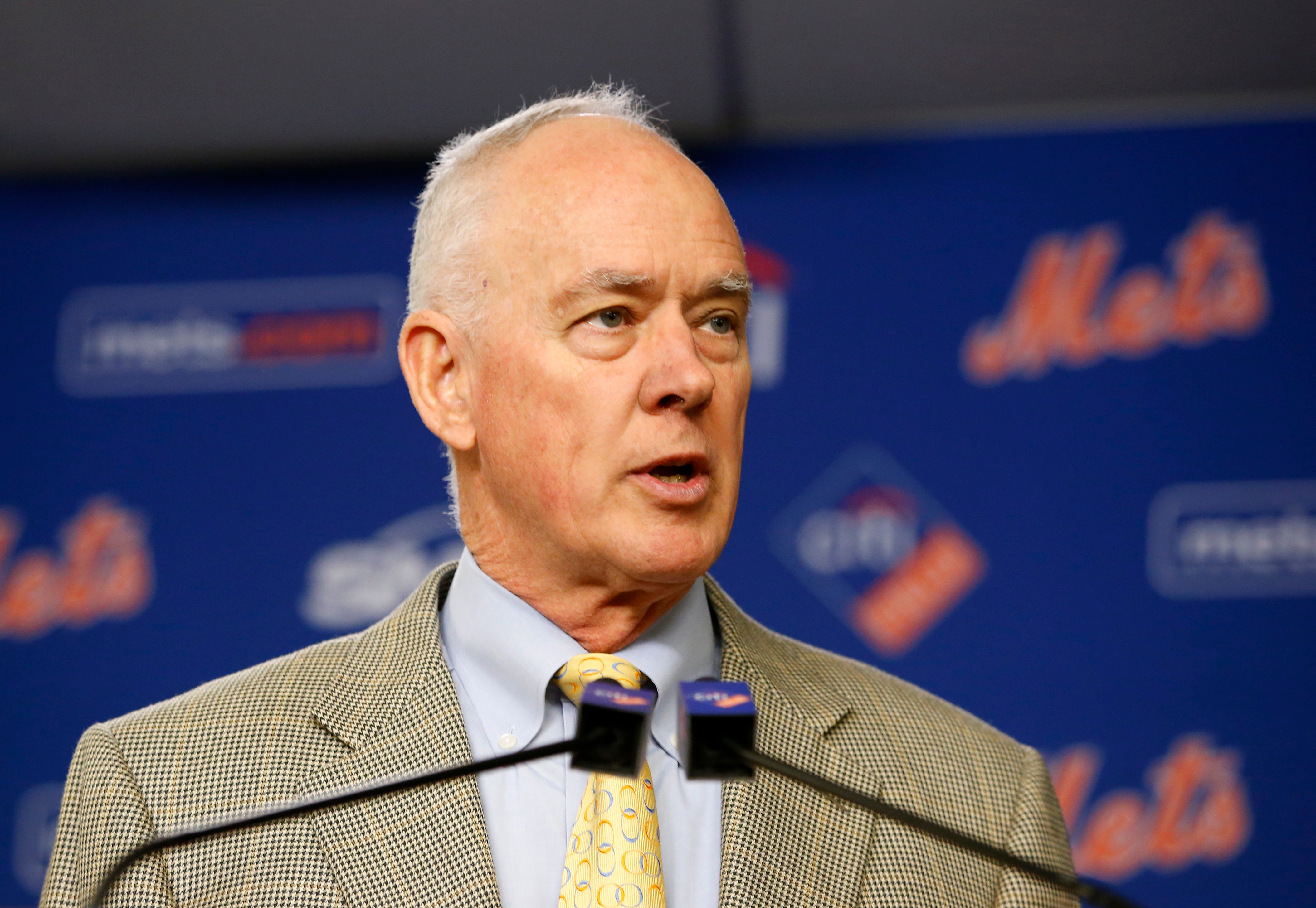 New York Mets general manager Sandy Alderson speaks during a press conference at CitiField in New York, Wednesday, Feb. 3, 2016, with Yoenis Cespedes after Cespedes signed a $75 million three-year contract with the team. (AP Photo/Kathy Willens) / Kathy Willens/AP