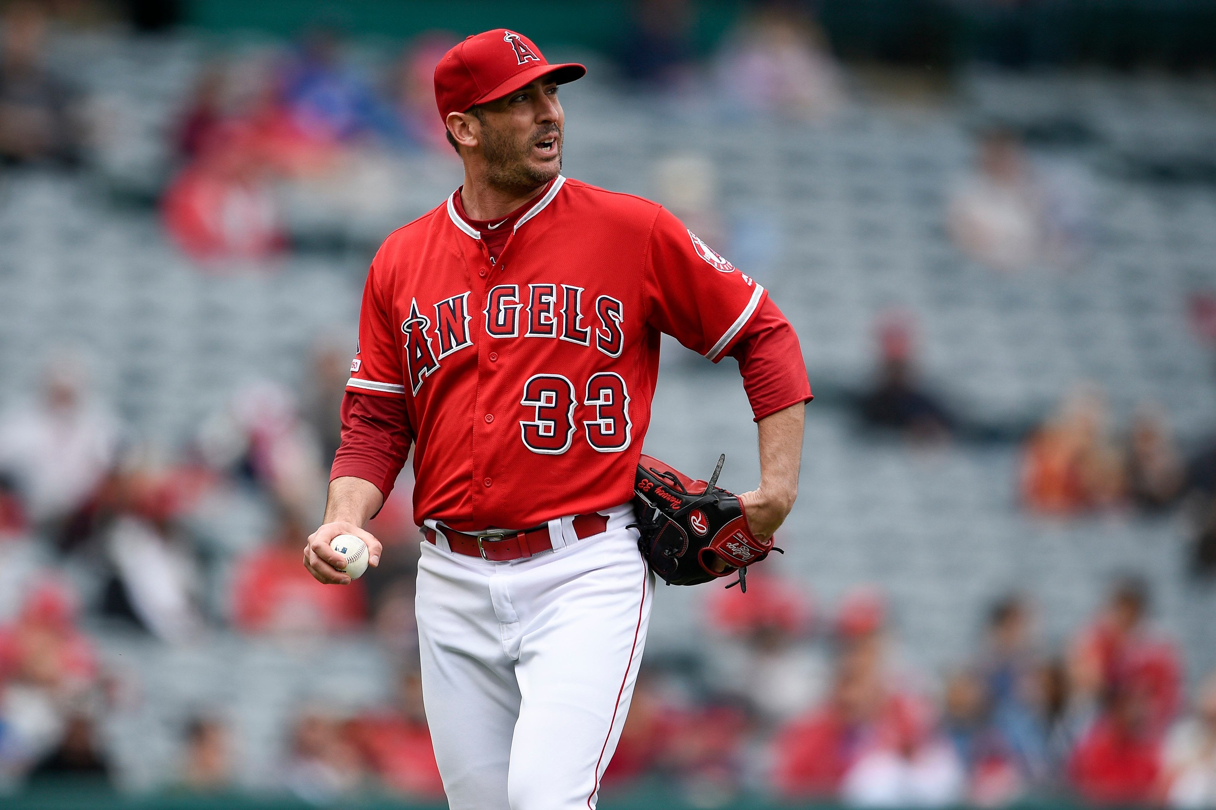 May 23, 2019; Anaheim, CA, USA; Los Angeles Angels starting pitcher Matt Harvey (33) reacts after allowing a single to Minnesota Twins left fielder Eddie Rosario (20) during the second inning at Angel Stadium of Anaheim. Mandatory Credit: Kelvin Kuo-USA TODAY Sports / Kelvin Kuo