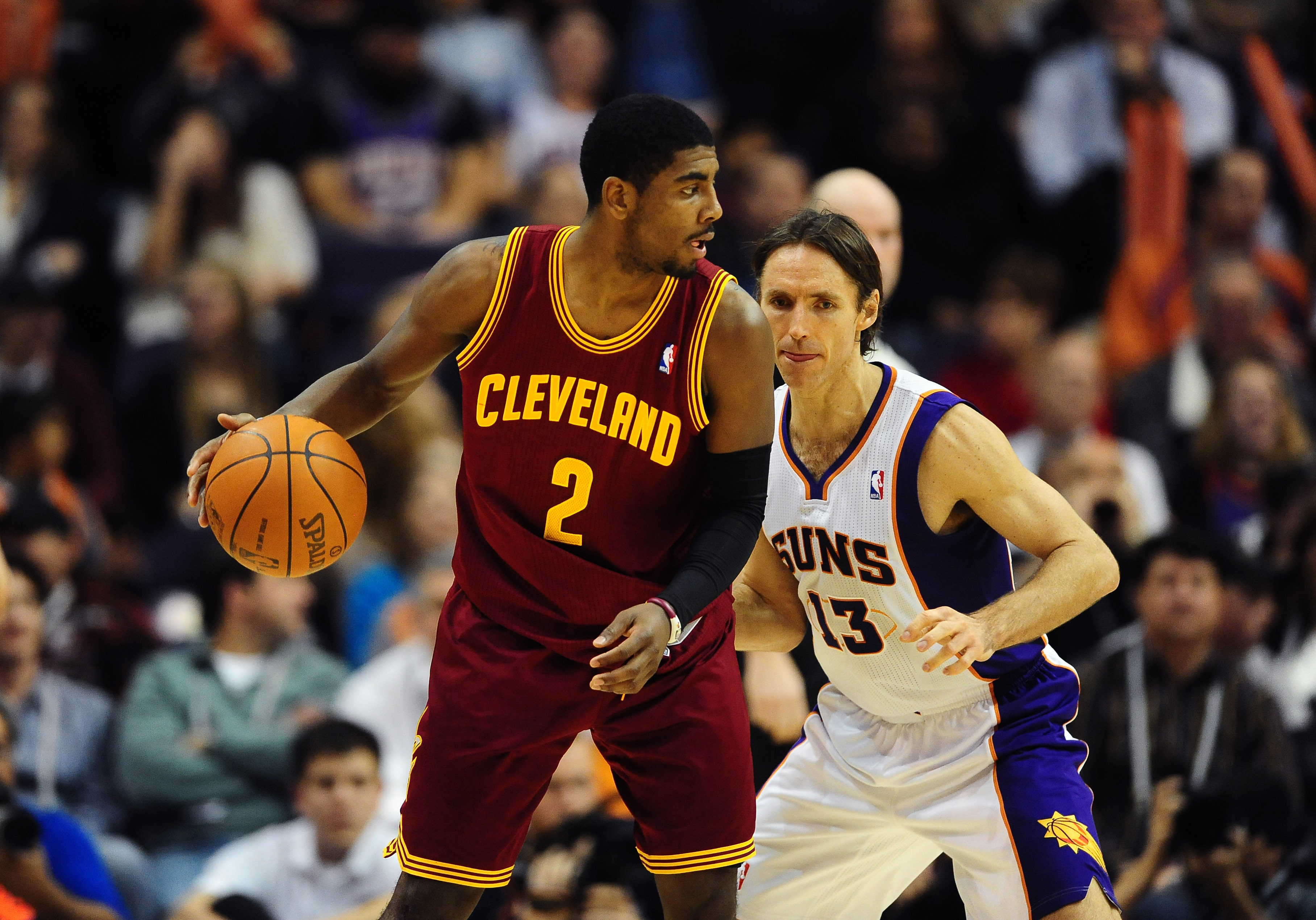 Jan. 12, 2012; Phoenix, AZ, USA; Cleveland Cavaliers guard (2) Kyrie Irving controls the ball against Phoenix Suns guard (13) Steve Nash in the first half at the US Airways Center. The Cavaliers defeated the Suns 101-90 / Mark J. Rebilas-USA TODAY Sports