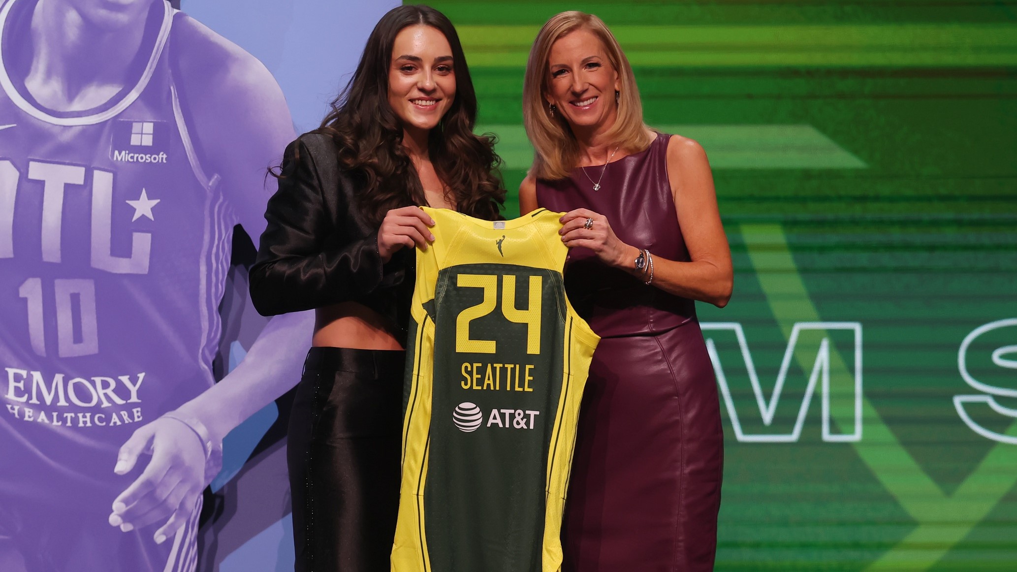 Apr 15, 2024; Brooklyn, NY, USA; Nika Muhl poses with WNBA commissioner Cathy Engelbert after she is selected with the number fourteen overall pick to the Seattle Storm in the 2024 WNBA Draft at Brooklyn Academy of Music. / Brad Penner-USA TODAY Sports