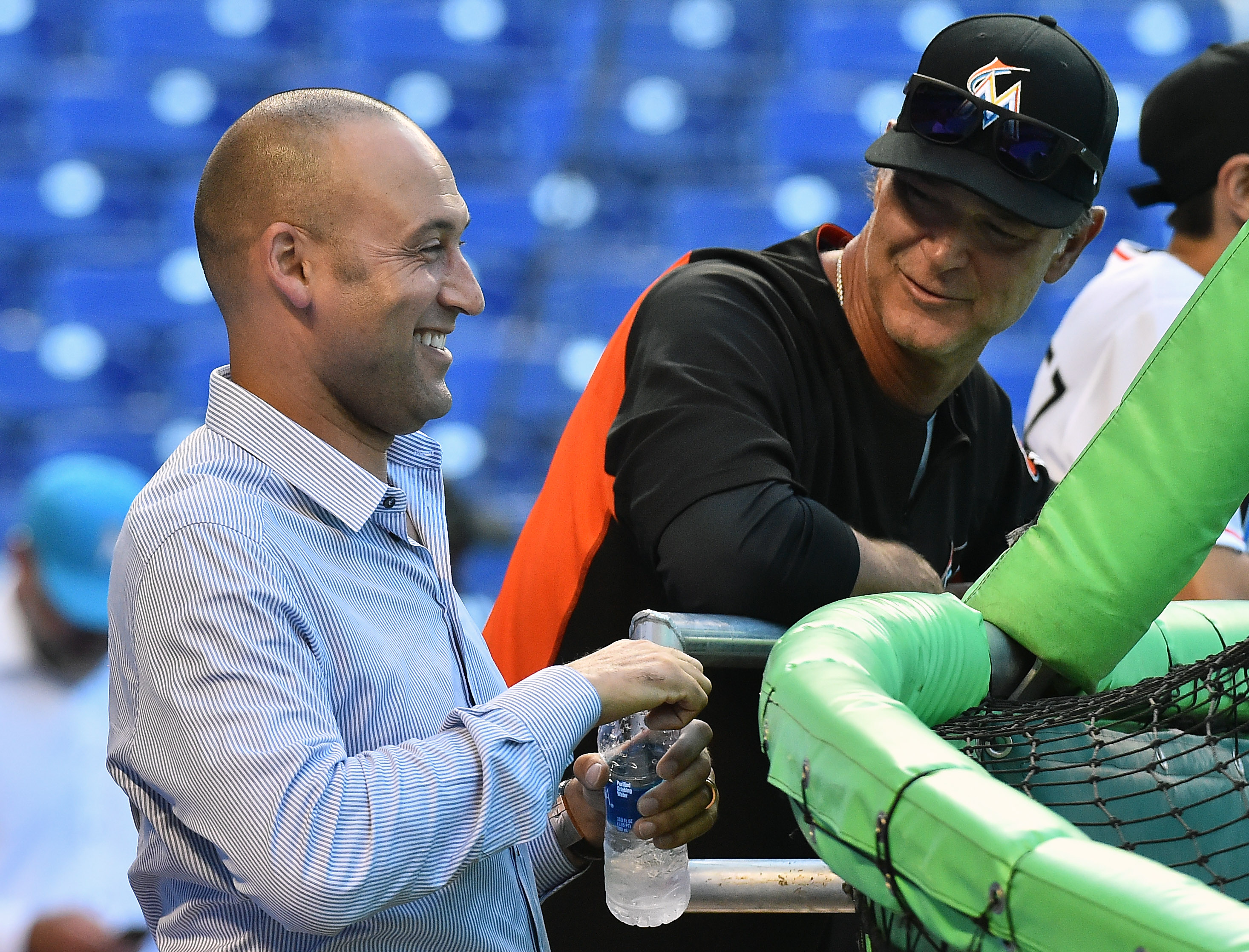 Apr 10, 2018; Miami, FL, USA; Miami Marlins chief executive officer Derek Jeter (R) and manager Don Mattingly (8) prior to the game against the New York Mets at Marlins Park. Mandatory Credit: Jasen Vinlove-USA TODAY Sports / Jasen Vinlove