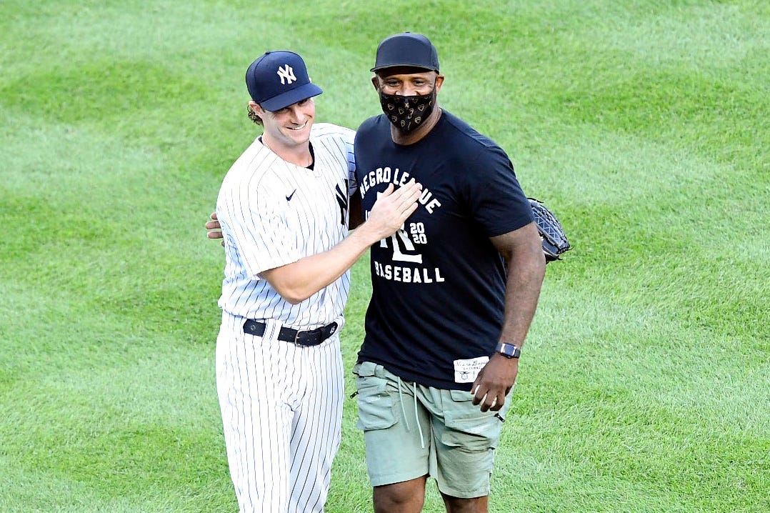 New York Yankees pitcher Gerrit Cole, left, and former pitcher CC Sabathia hug after Sabathia throws out the first pitch before the Yankees take on the Boston Red Sox on Friday, July 31, 2020, in New York. Yanks Home Opener / Danielle Parhizkaran/NorthJersey.com via Imagn Content Services, LLC