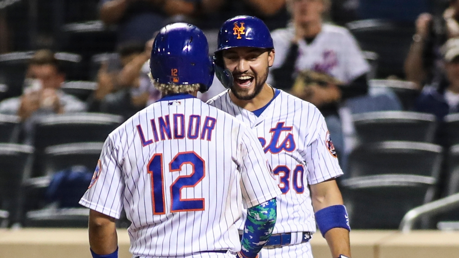 Sep 12, 2021; New York City, New York, USA; New York Mets shortstop Francisco Lindor (12) is greeted by right fielder Michael Conforto (30) after hitting his third home run of the game in the eighth inning against the New York Yankees at Citi Field. / Wendell Cruz-USA TODAY Sports