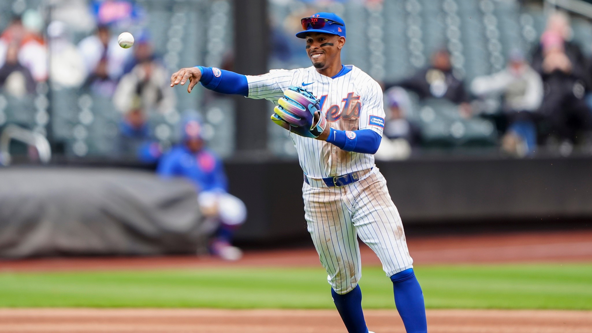 Apr 4, 2024; New York City, New York, USA; New York Mets shortstop Francisco Lindor (12) throws out Detroit Tigers right fielder Matt Vierling (not pictured) after fielding a ground ball during the fourth inning at Citi Field. / Gregory Fisher-USA TODAY Sports