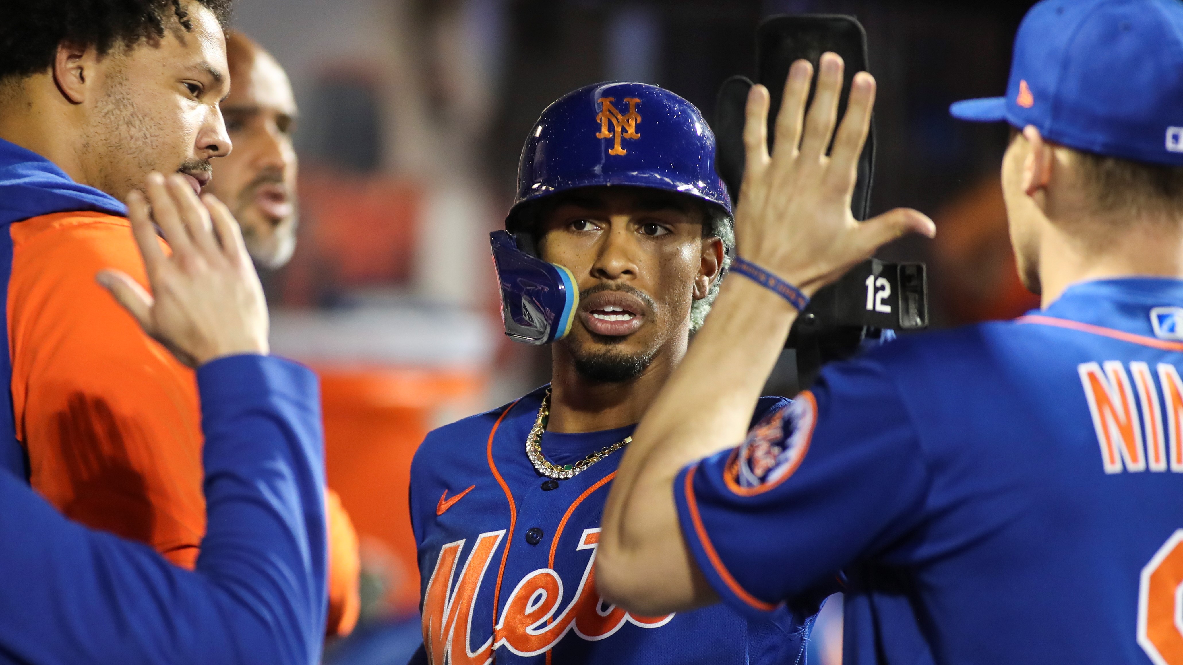 May 28, 2022; New York City, New York, USA; New York Mets shortstop Francisco Lindor (12) is greeted in the dugout after hitting a two run triple in the fifth inning at Citi Field. Mandatory Credit: Wendell Cruz-USA TODAY Sports / Wendell Cruz-USA TODAY Sports