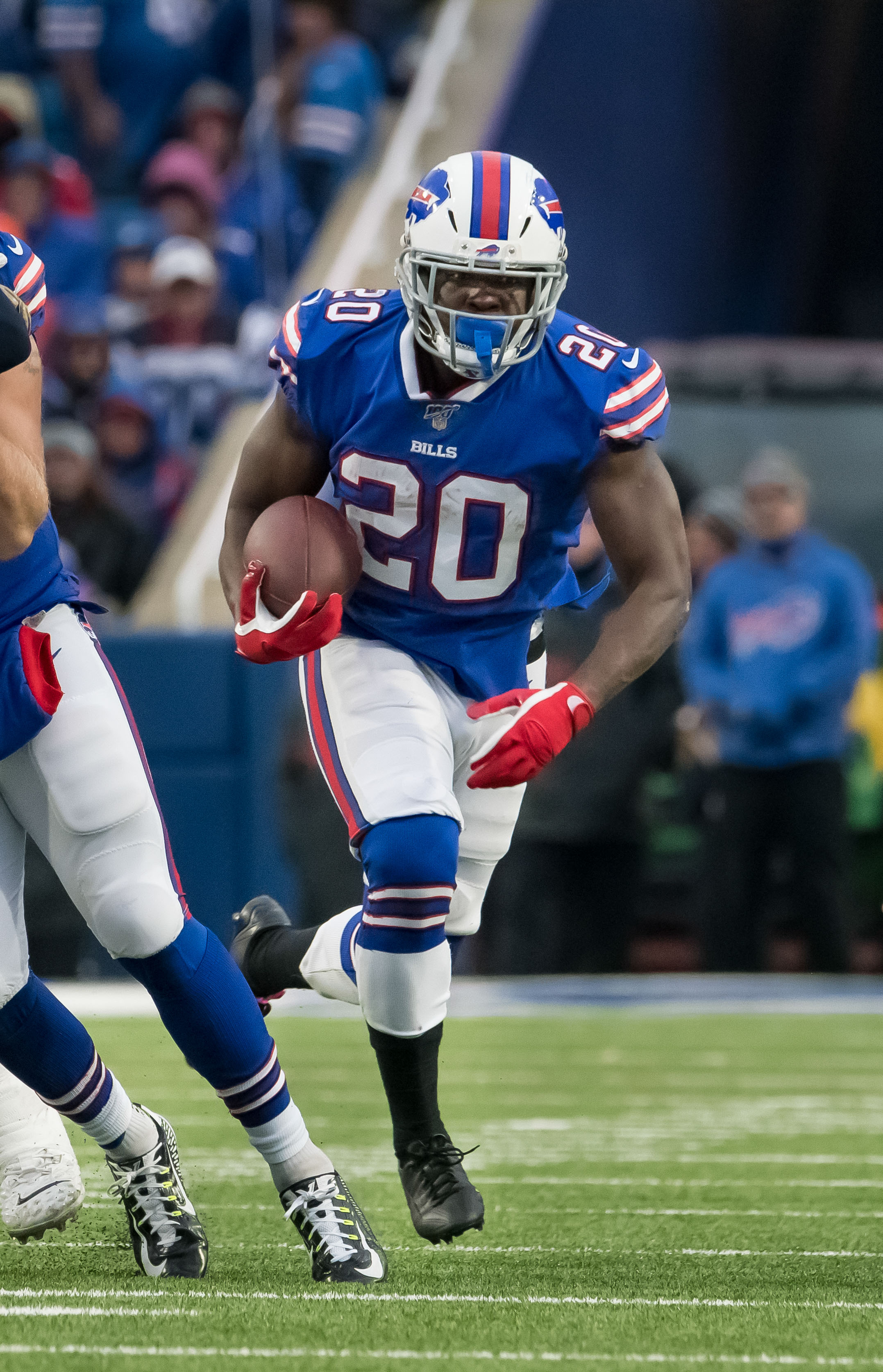 Nov 24, 2019; Orchard Park, NY, USA; Buffalo Bills running back Frank Gore (20) against the Denver Broncos in the fourth quarter at New Era Field. Mandatory Credit: Mark Konezny-USA TODAY Sports / Mark Konezny