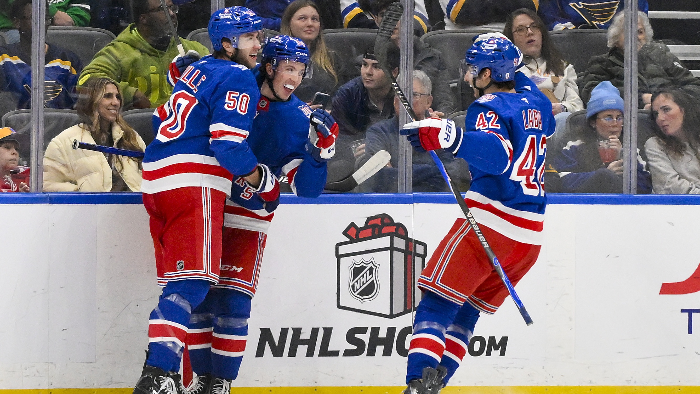 New York Rangers right wing Gabe Perreault (94) celebrates with left wing Will Cuylle (50) and center Noah Laba (42) after scoring his first NHL goal during the second period against the St. Louis Blues at Enterprise Center / Jeff Curry - Imagn Images