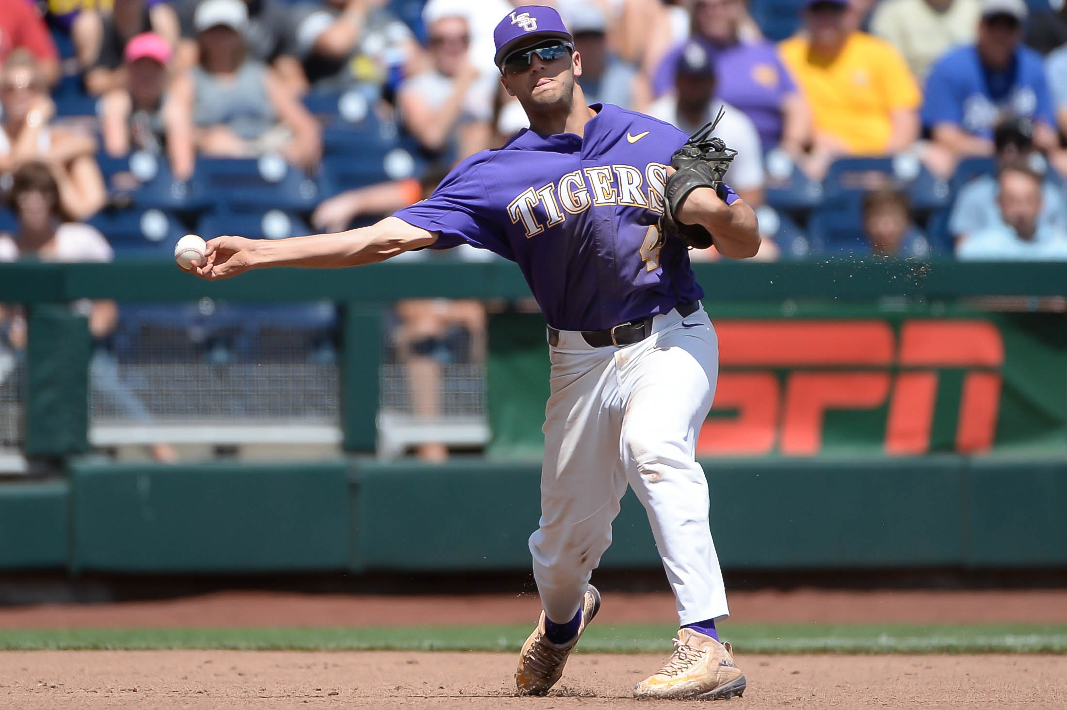 LSU Tigers infielder Josh Smith throws to first base in the third inning against the Oregon State Beavers at TD Ameritrade Park Omaha. / Steven Branscombe/USA TODAY Sports
