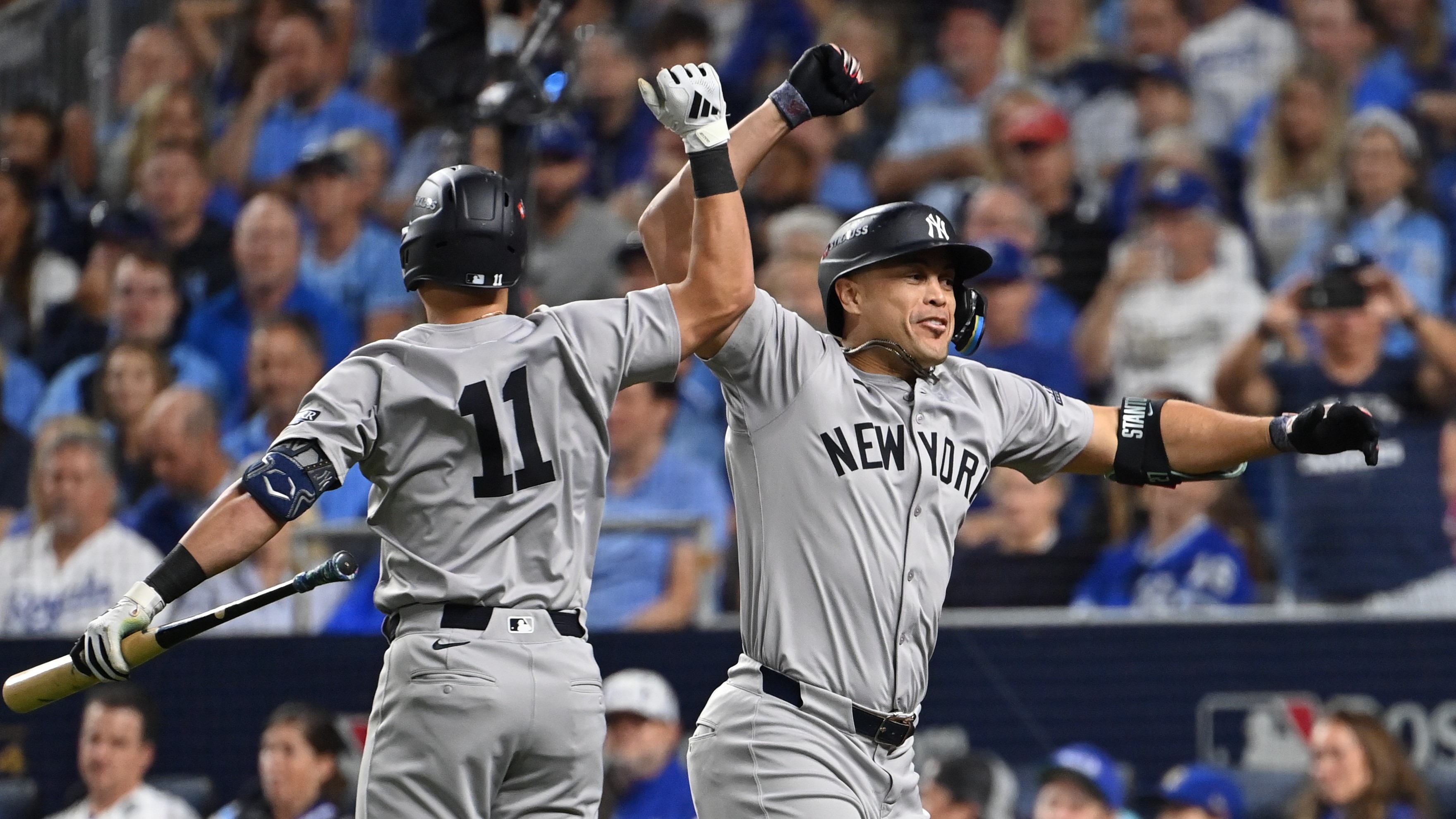 Giancarlo Stanton's postseason worth to Yankees shows with potential signature moment in ALDS Game 3 winYankees not named Stanton were a combined 1-for-25 in the pivotal road victory10/10/2024, 4:30 AMAnthony McCarronMLB freelance writer/on-air talentOct 9, 2024; Kansas City, Missouri, USA; New York Yankees designated hitter Giancarlo Stanton (27) runs the bases after hitting a home run in the eighth inning against the Kansas City Royals during game three of the NLDS for the 2024 MLB Playoffs at Kauffman Stadium. Mandatory Credit: Peter Aiken-Imagn Images / © Peter Aiken-Imagn ImagesOct 9, 2024; Kansas City, Missouri, USA; New York Yankees designated hitter Giancarlo Stanton (27) celebrates with New York Yankees third base Jazz Chisholm Jr. (13) after the hitting a home run in the eighth inning against the Kansas City Royals during game three of the NLDS for the 2024 MLB Playoffs at Kauffman Stadium. Mandatory Credit: Peter Aiken-Imagn Images / © Peter Aiken-Imagn Images