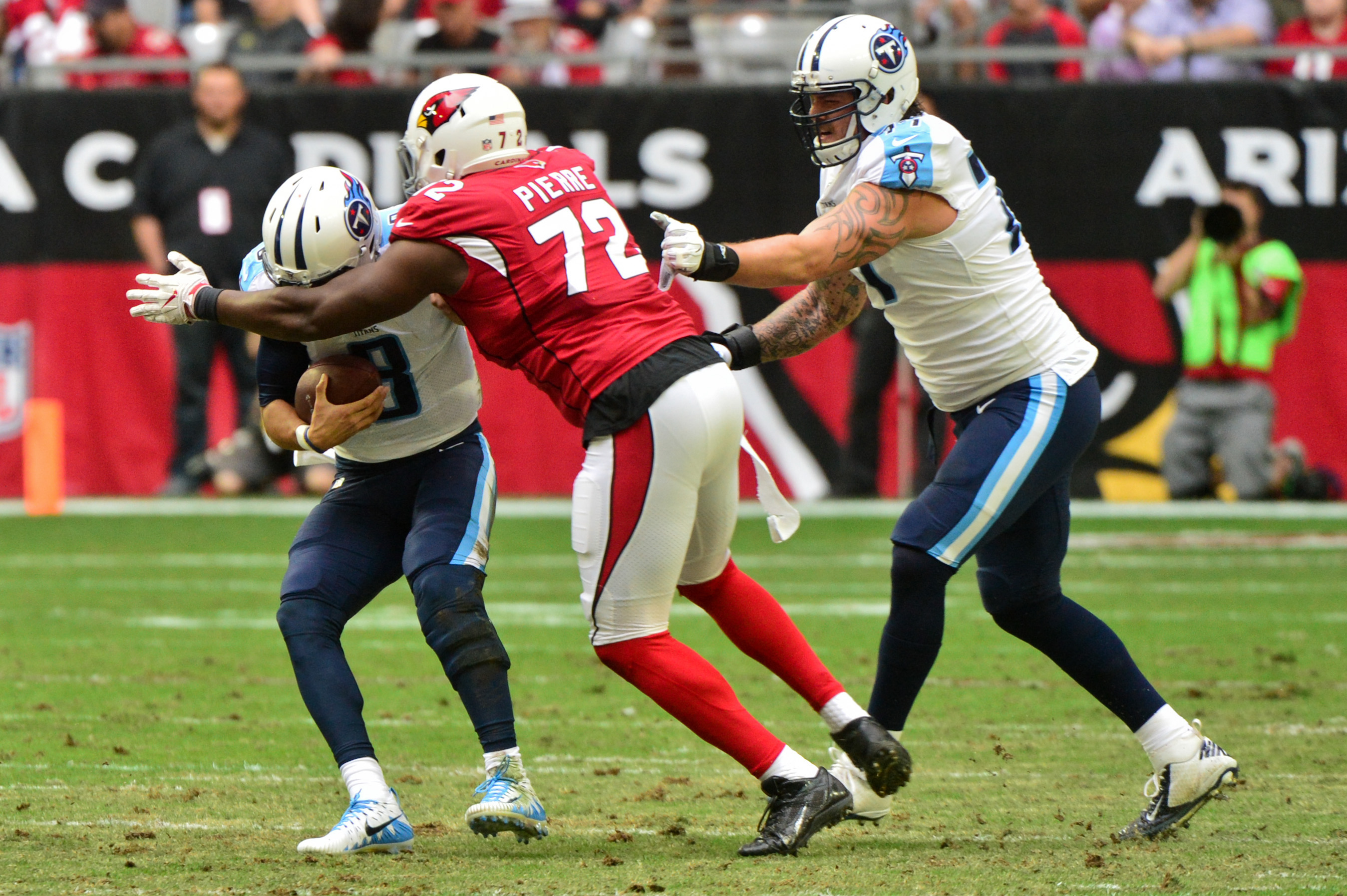 Dec 10, 2017; Glendale, AZ, USA; Arizona Cardinals defensive tackle Olsen Pierre (72) sacks Tennessee Titans quarterback Marcus Mariota (8) during the first half at University of Phoenix Stadium. Mandatory Credit: Matt Kartozian-USA TODAY Sports / Matt Kartozian