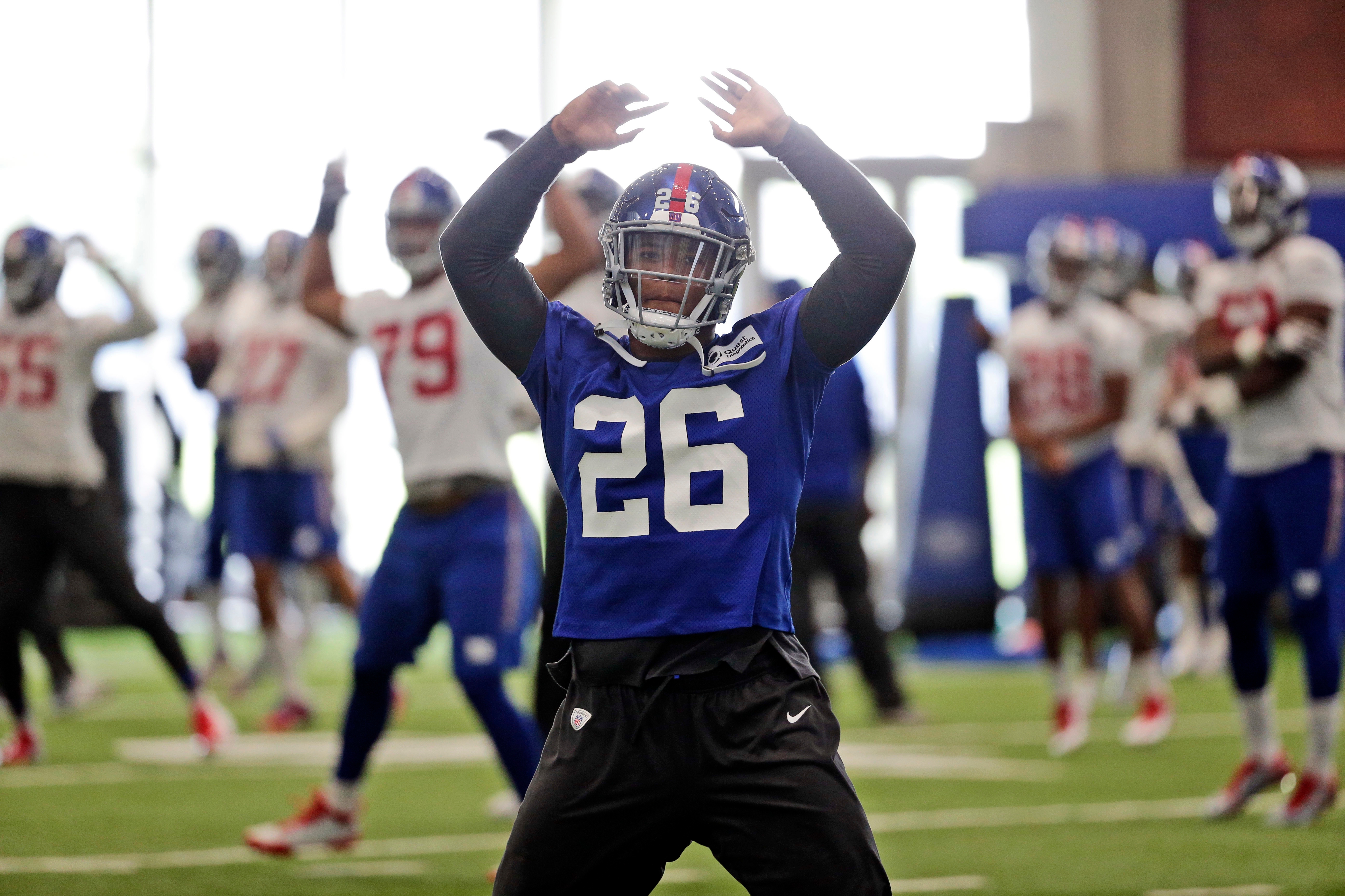New York Giants' Saquon Barkley warms-up during practice at the NFL football team's training camp in East Rutherford, N.J., Monday, June 4, 2018. (AP Photo/Seth Wenig) / Seth Wenig/AP