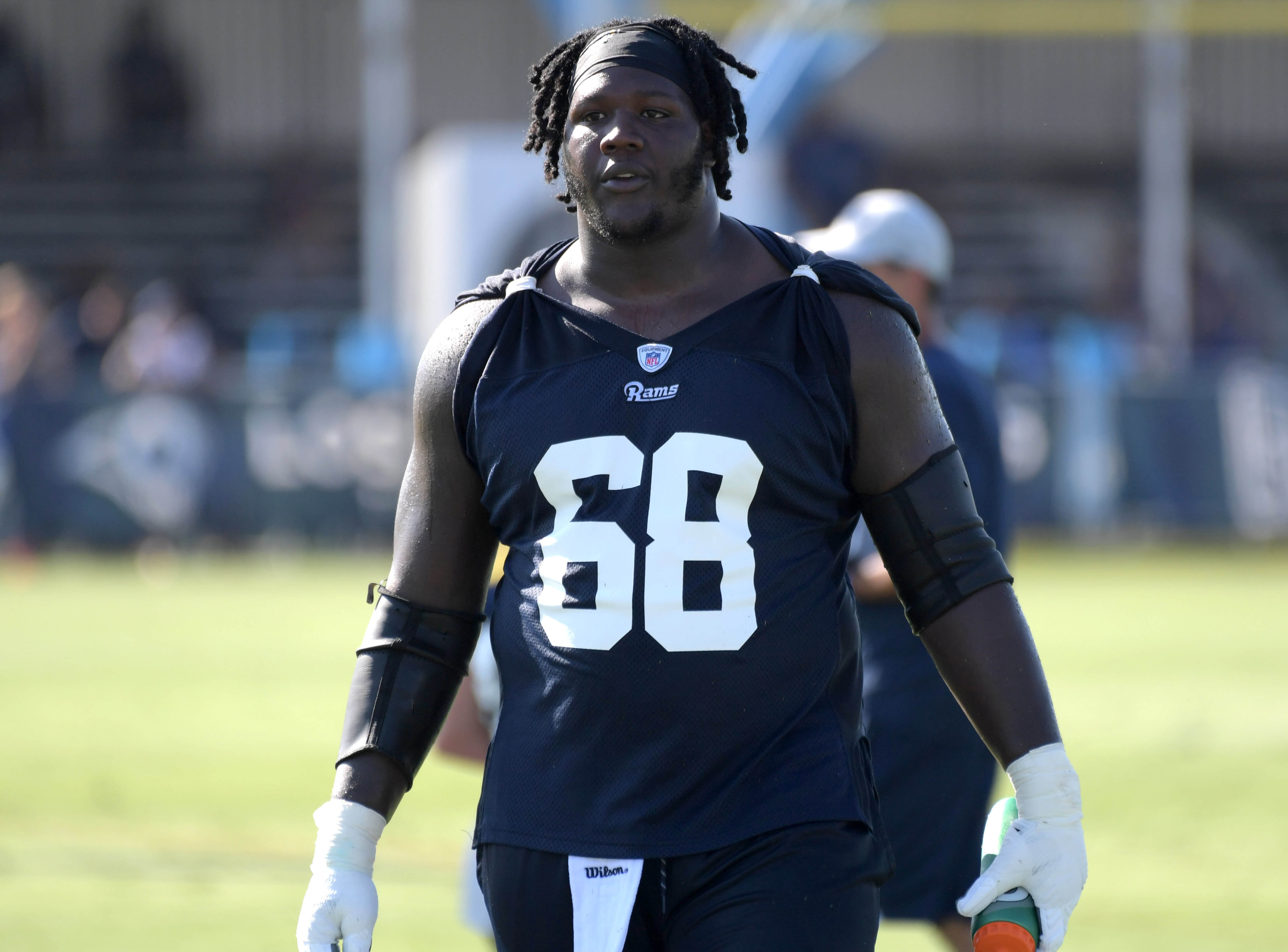 Jul 27, 2018; Irvine, CA, USA; Los Angeles Rams guard Jamon Brown (68) during training camp at UC Irvine. Mandatory Credit: Kirby Lee-USA TODAY Sports / Kirby Lee
